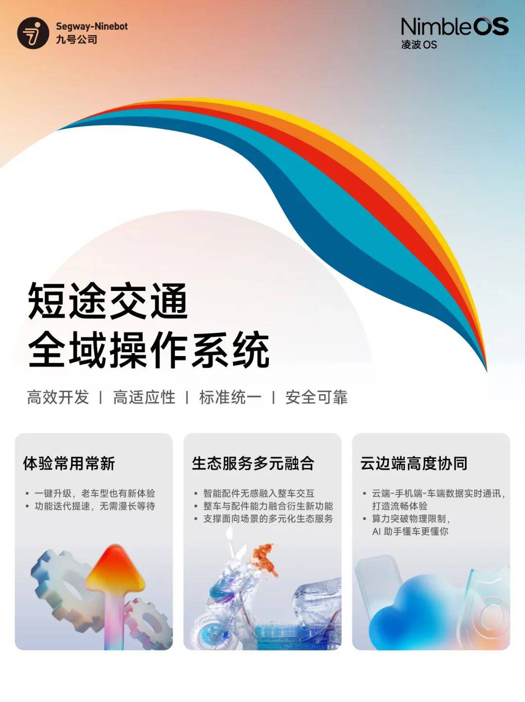 發(fā)布會的另一重磅發(fā)布是九號自主研發(fā)的凌波OS(NimbleOS)短途交通全域操作系統(tǒng),該系統(tǒng)以「持續(xù)升級、能力融合、云邊端協(xié)同」為核心特性,構建起覆蓋短途交通全場景的智能生態(tài)底座。