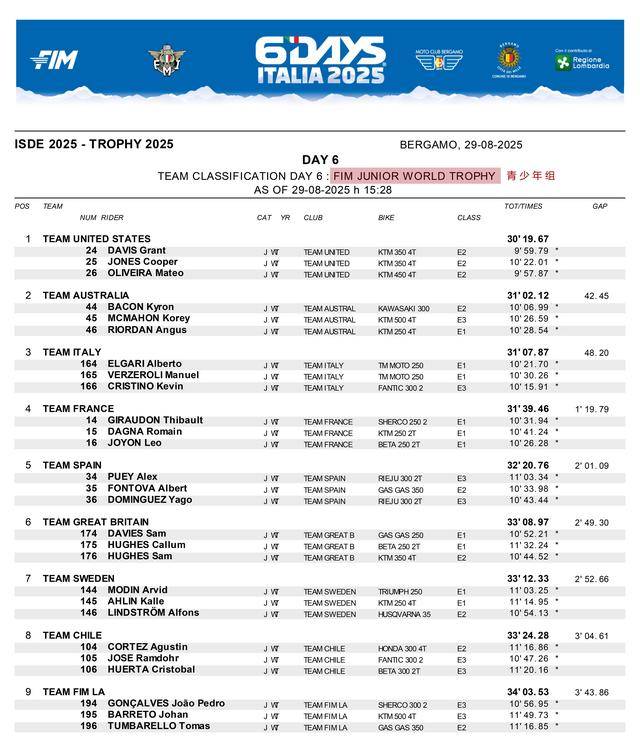 一年一度的 FIM 國際六天耐力越野賽(FIM International Six Days' Enduro,今年的比賽也被稱之為 6DAYS FIM Enduro of Nations 六天耐力越野國家杯,簡稱為 FIM 6DAYS。而此前的名稱是 FIM International Six Days Enduro、簡稱 ISDE),八月 24 - 29 日、在意大利北部城市貝加莫Bergamo)的郊區(qū)舉行。