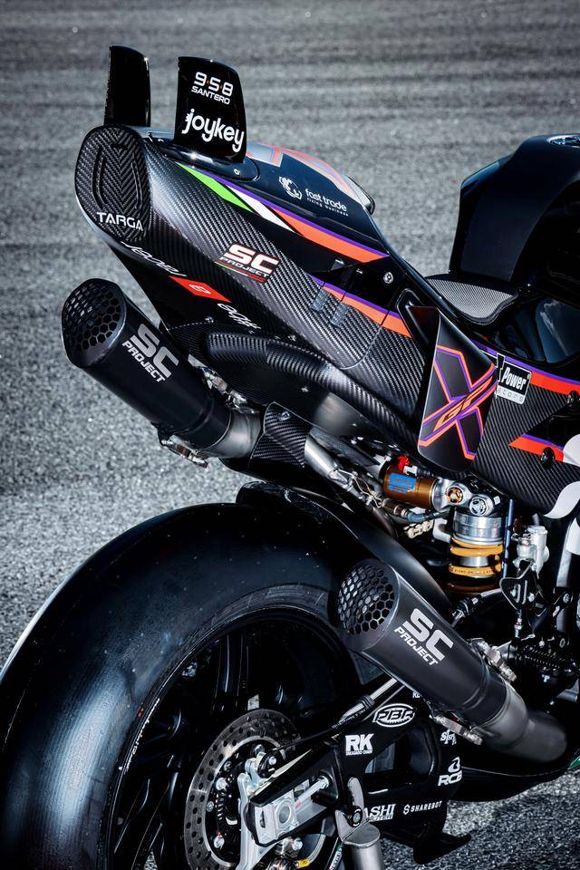 新車的另一個焦點,是其車身的造型設(shè)計:RSV4 X-GP 的空氣動力學(xué)造型、與最新版本的 RS-GP25 密切相關(guān),位于腿部和車體尾部定風(fēng)翼的空氣動力學(xué)組件,由阿普利亞賽車部門獨家開發(fā)并擁有相關(guān)的專利技術(shù),這兩個組件都是在幾個月前、才被首次應(yīng)用到 RS-GP25 上。全車的整套定風(fēng)翼組合,在制動和轉(zhuǎn)向時、可為車輛增加空氣動力學(xué)載荷,除了讓 RSV4 X-GP 在外觀上與 RS-GP 更相似之外,還增加了抓地力,確保了后輪胎性能、并向車手提供了一個更直接的感覺。