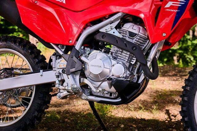在這樣的背景下,Honda 向美洲市場(chǎng)推出了這款新一代的旗艦級(jí)休閑型越野車 2026 CRF300F。該車搭載一副與上述三個(gè)車型相同的風(fēng)/油冷四沖程單氣缸、SOHC 四氣閥的發(fā)動(dòng)機(jī),缸徑、行程為 77 mm x 63 mm(上一代 CRF250F 為 71 mm x 63 mm),排氣量 293.5 cc(CRF250F 為 249.8 cc);配備了 PGM-FI 電子燃油噴注系統(tǒng)、口徑為 34 mm 的節(jié)氣閥,電啟動(dòng),六檔的變速齒輪箱(CRF250F 采用五檔的變速齒輪箱),峰值動(dòng)力輸出 24.6 匹。