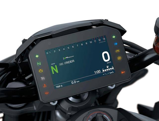 電子輔助控制系統(tǒng)方面,新一代車型搭載了更多的裝備:集成了 6 軸 IMU,為 KCMF 轉(zhuǎn)彎管理、KTRC 牽引力控制、KIBS 集成式制動(dòng)(ABS)提供支持;標(biāo)配了電子控制油門,提供四個(gè)可選(Sport 運(yùn)動(dòng)、Road 公路、Rain 雨天、Rider 騎士自定義)的動(dòng)力模式,此外還標(biāo)配了雙向(升檔 + 降檔)快速換檔系統(tǒng)。