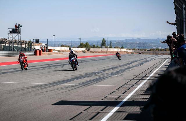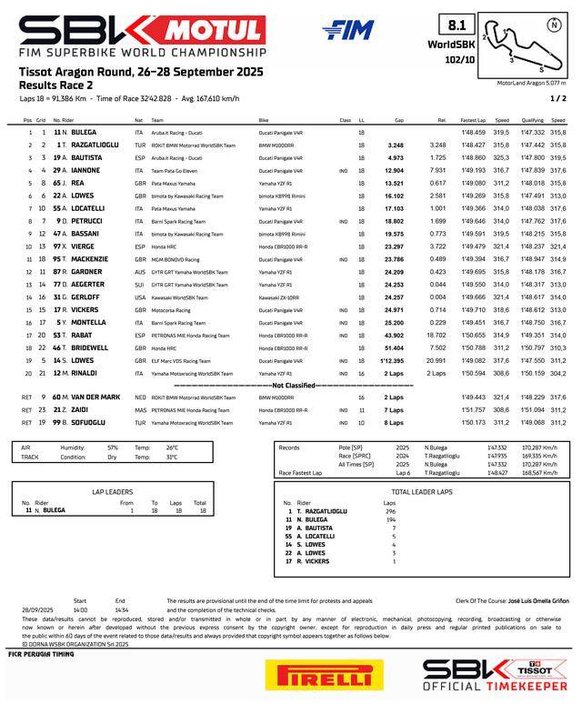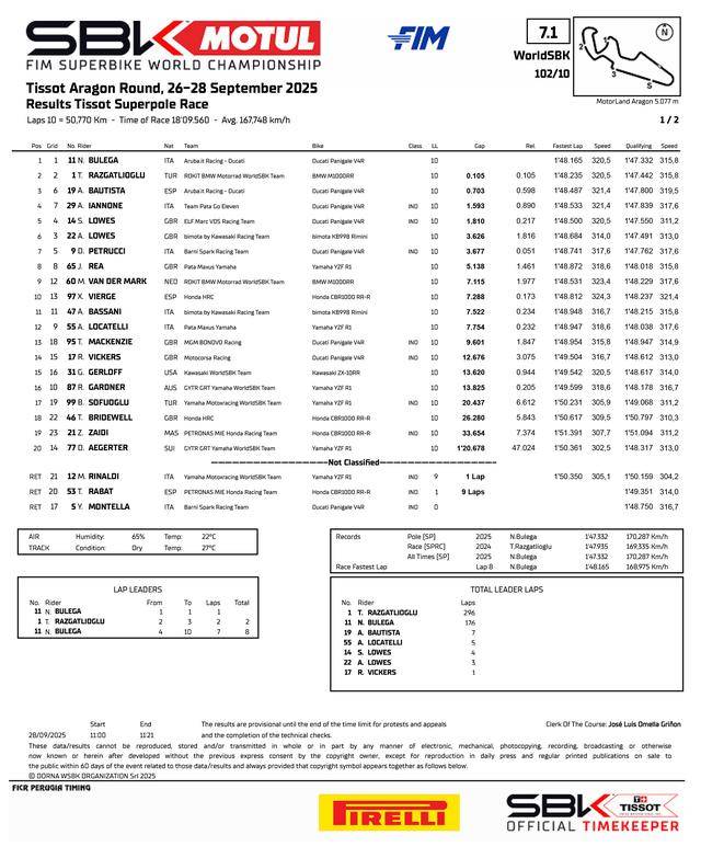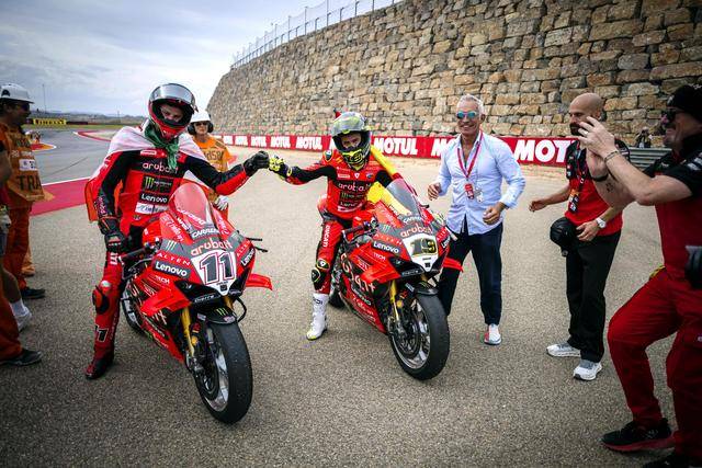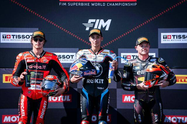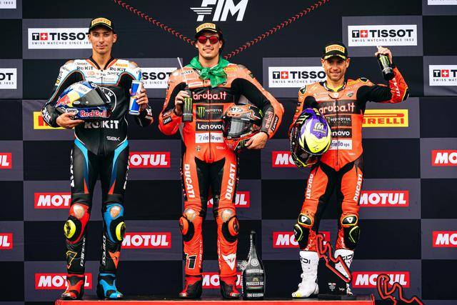 賽程為 10 圈的超級排位賽正賽(Super Pole Race),前面繼續(xù)是拉格里奧盧與杜卡迪陣營的對抗,布雷加最終拿到了第一,拉格里奧盧落后 0.105 秒、獲得了第二,駕駛 19 號車的西班牙車手捌弟(Alvaro Bautista,巴迪斯塔)拿到了第三。
