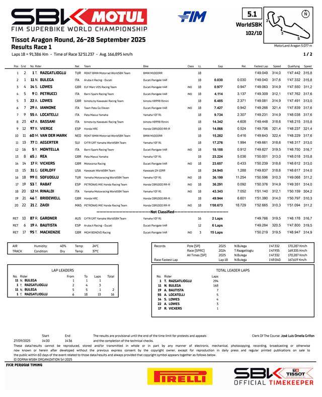周末(九月 27 日)進(jìn)行的第一節(jié)比賽,18 圈的賽程,兩位處于積分榜前面的車手,拉格里奧盧與布雷加從起步一直拼到最后沖線,最終拉格里奧盧奪得了冠軍,布雷加落后前車僅僅 0.03 秒獲得了亞軍。來自獨立車隊、14 號車的 S. 洛維斯(Sam Lowes)落后冠軍不到 1 秒,拿到了季軍,2025 賽季第二次登上頒獎臺。