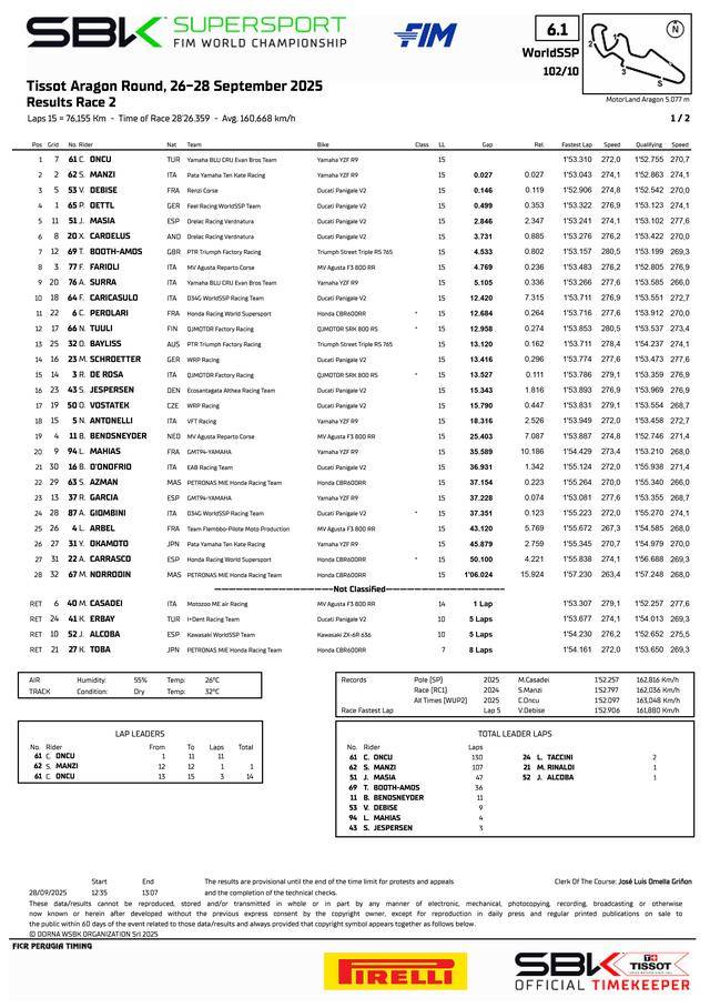 兩節(jié)正賽都是一如既往的肉搏戰(zhàn),杜卡迪陣營、53 號車的法國車手德比斯(Valentin Debise),在第一節(jié)比賽里,與 61 號車、Yamaha 陣營的土耳其車手昂庫(Can Oncu)激戰(zhàn)全程,最終以 0.197 秒的優(yōu)勢、為杜卡迪陣營拿到今年的第二場勝利;昂庫獲得亞軍;積分榜的領(lǐng)先者,62 號車的意大利車手曼茲(Stefano Manzi)拿到了季軍。