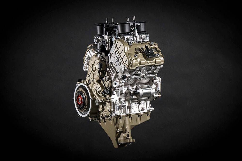 這具引擎導(dǎo)入更輕(減重 5.1%)的活塞與增加慣量的鍛造鋼曲軸,帶來更線性的油門反應(yīng),實(shí)際上就是 MotoGP Desmosedici 賽車的 homologation 版本。 極速表現(xiàn)同樣驚人,原廠排氣下達(dá)318.4公里/小時(shí),換裝賽道排氣后突破330公里/小時(shí),已經(jīng)直逼MotoGP水平。