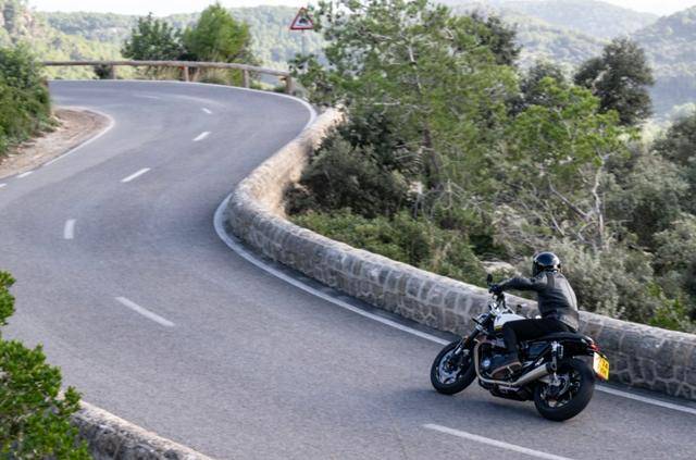 “速度雙缸”的操控性能比較靈活。凱旋工程師安裝了鋼管搖籃式車架,軸距設(shè)置為1413mm,后傾角和拖曳距分別是22.4º和91mm。這樣的轉(zhuǎn)向幾何設(shè)置比上一代更加積極,讓這樣的“現(xiàn)代經(jīng)典”騎乘起來有點(diǎn)像運(yùn)動型街車,為騎手創(chuàng)造平衡感較強(qiáng)的駕駛體驗(yàn)。懸掛系統(tǒng)方面同樣做了提升,前輪安裝了馬祖奇43mm倒立式前叉,替代了原來的41mm正立式前叉;后部沒有沿用慣常的單筒減震器,而是用上了雙筒減震器,營造古香古色的韻味。