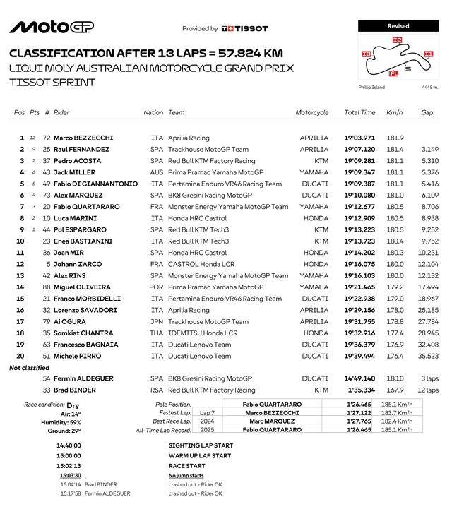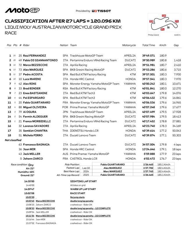 最終,費(fèi)南德茲順利奪得了澳大利亞站的冠軍,拿到了在最高級(jí)別的首個(gè)分站冠軍,同時(shí)也為阿普利亞奪得了他們自 1987 年以來(lái),在 GP 征程里的第三百次分站冠軍,這讓他們成為了奪冠次數(shù)最多的歐洲制造商。憑借著下半場(chǎng)比賽里的全力加速,49 號(hào)車的意大利車手吉南托里奧(Fabio Di Giannantonio)奪得了亞軍,2025 賽季第三次登上頒獎(jiǎng)臺(tái);貝澤奇獲得了季軍。