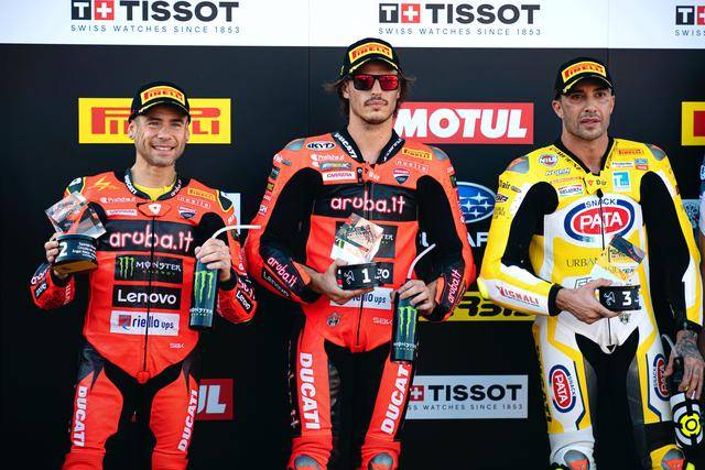 最高級別 WSBK 的賽前 Super Pole 超級排位賽,積分榜前兩名的車手占據(jù)的最靠前的兩個發(fā)車位置:駕駛 11 號車的意大利車手布雷加(Nicolo Bulega)拿到了排頭位發(fā)車,積分榜的領(lǐng)先者、駕駛 1 號車的土耳其車手拉格里奧盧(Toprak Razgatlioglu)排在第二;駕駛 14 號車的英國車手 S. 洛維斯(Sam Lowes)拿到第一排發(fā)車位置的最后一席。