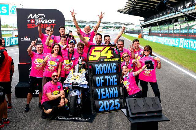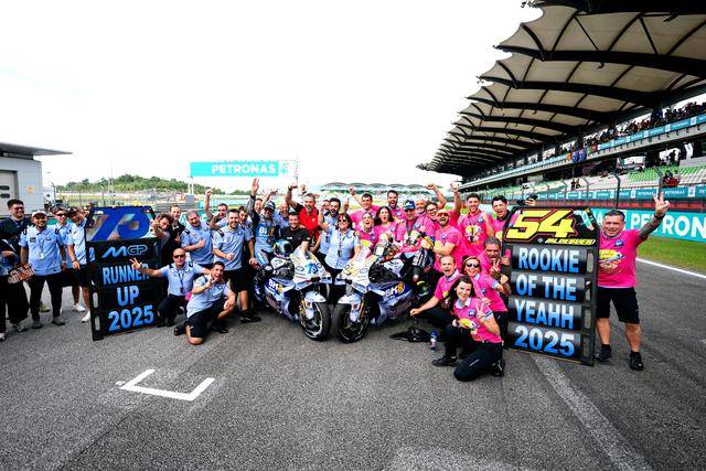 對(duì)于吉斯尼 MotoGP 車(chē)隊(duì)(Gresini MotoGP)來(lái)說(shuō),馬來(lái)西亞站是他們的半個(gè)主場(chǎng)之一,且參考往績(jī),他們?cè)谶@里往往有著超強(qiáng)的發(fā)揮。而在沖刺賽結(jié)束后,除了小馬昆斯拿下年度總亞軍之外,他的隊(duì)友、駕駛 54 號(hào)車(chē)的西班牙車(chē)手阿爾德格(Fermin Aldeguer)拿到了第七名,同時(shí)也獲得了足夠的積分優(yōu)勢(shì),提前奪得了今年的 MotoGP 最佳新秀。
