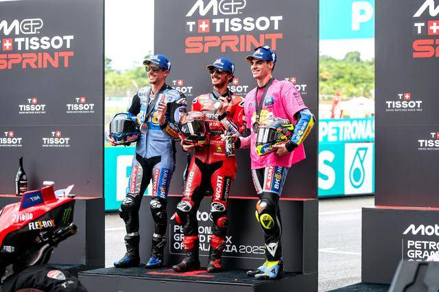 周日(十月 26 日)舉行的 MotoGP 級(jí)別正賽,賽程為 20 圈。起跑后不久,小馬昆斯就超越了巴納亞、搶到了領(lǐng)先位置,并在隨后的比賽里全力推進(jìn)、力求擺脫對(duì)手們的糾纏;半場(chǎng)的努力加速,到完成第 13 圈比賽后,一直跑在前面的小馬昆斯、已經(jīng)拉開(kāi)了與后車(chē)接近 2 秒的距離。最終,他順利奪得了馬來(lái)西亞站正賽的冠軍,拿到了 2025 賽季、同時(shí)也是他的職業(yè)生涯中,在最高級(jí)別的第三次分站冠軍。而小馬昆斯的這個(gè)冠軍,也助力了在這場(chǎng)比賽中、采用了特別圖案出戰(zhàn)的吉斯尼 MotoGP 車(chē)隊(duì),奪得了 2025 賽季的最佳獨(dú)立車(chē)隊(duì)/衛(wèi)星車(chē)隊(duì)。