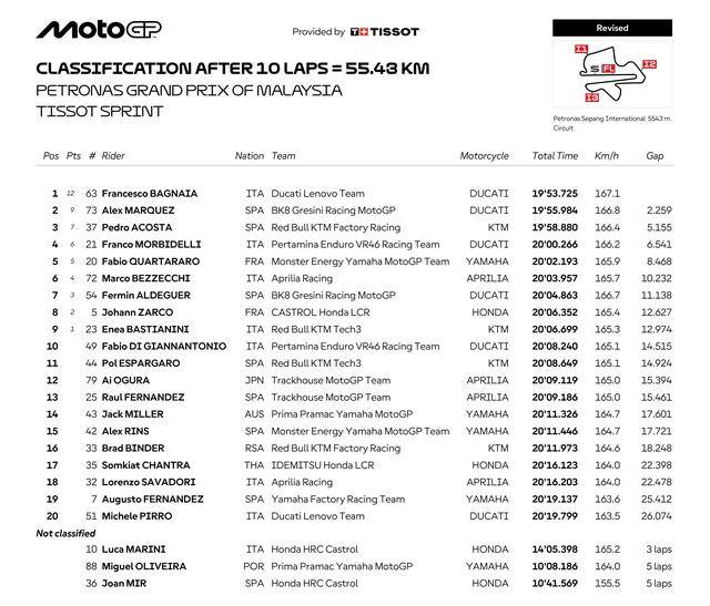 MotoGP 級(jí)別,賽前的 Q2 排位賽,駕駛 63 號(hào)車(chē)的意大利車(chē)手巴納亞(Francesco Bagnaia)拿到了排頭位發(fā)車(chē);73 號(hào)車(chē)的西班牙車(chē)手小馬昆斯(Alex Marquez)、21 號(hào)車(chē)的意大利車(chē)手莫比戴利,分別占據(jù)了第一排發(fā)車(chē)位置的另外兩席。