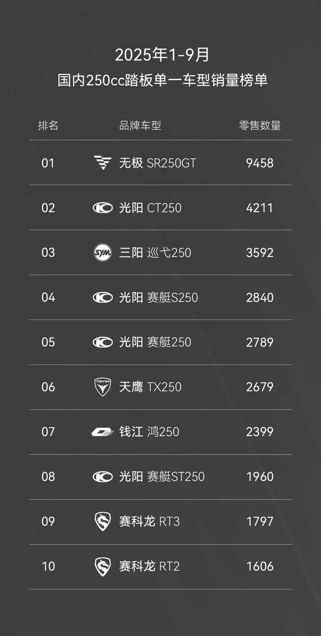 2025年1到9月的銷(xiāo)量榜單已經(jīng)出來(lái)了,我們看到其中250踏板的榜單還是很有意思的,單車(chē)型的銷(xiāo)冠是無(wú)極的SR250GT,9458臺(tái)的銷(xiāo)量已經(jīng)比第二名翻一倍了,和光陽(yáng)250系列全部車(chē)型的總銷(xiāo)量也沒(méi)差多少了,已經(jīng)基本可以說(shuō)SR250GT就是今年的250踏板銷(xiāo)量王了。