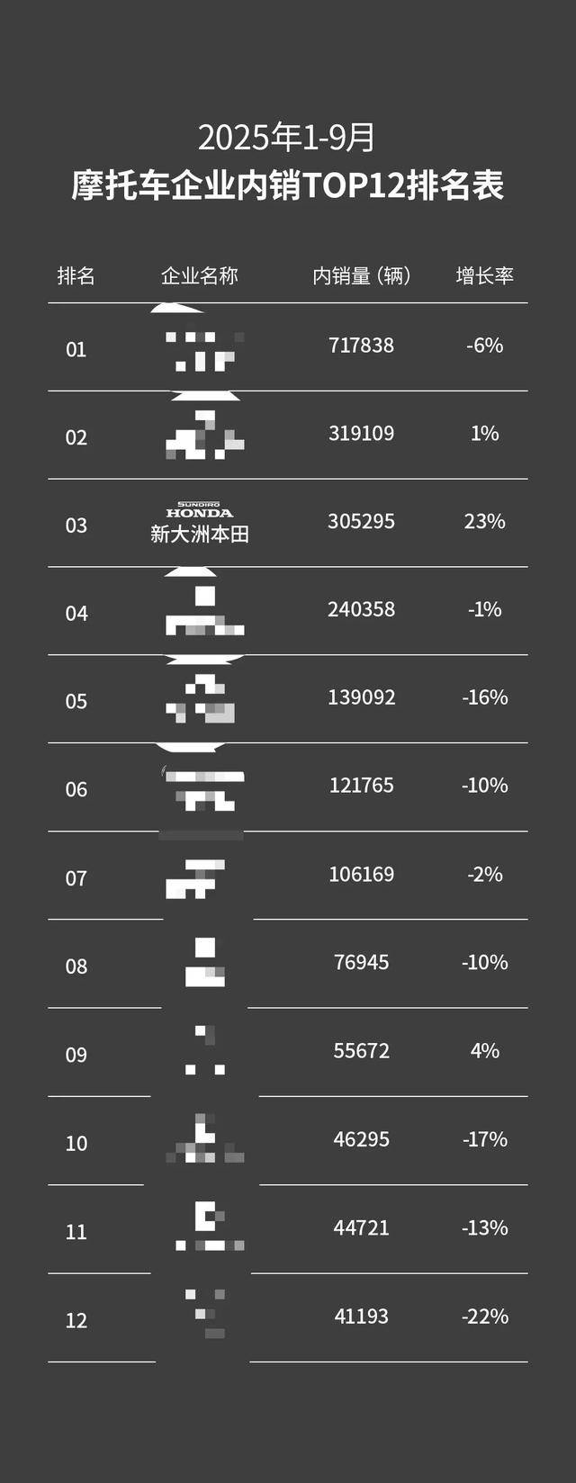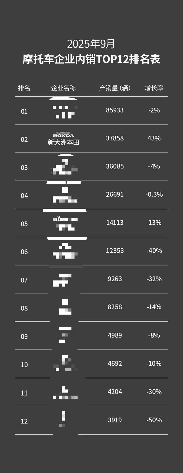如果你認為筆者上述言論純屬胡說八道,相信新大洲本田現(xiàn)在的表現(xiàn)一定會“懟”得你啞口無言。先讓我們來看看2025年1至9月國內(nèi)摩市的銷量排名。截至2025年9月底,新大洲本田的國內(nèi)銷量為305295輛,位居全行業(yè)第三名,其中,9月的銷量達到37858輛,居全行業(yè)第二名。