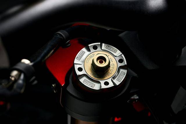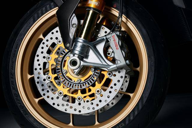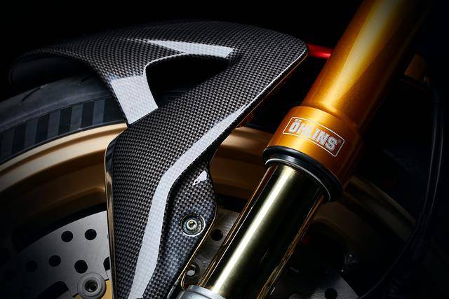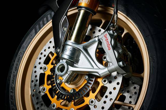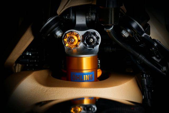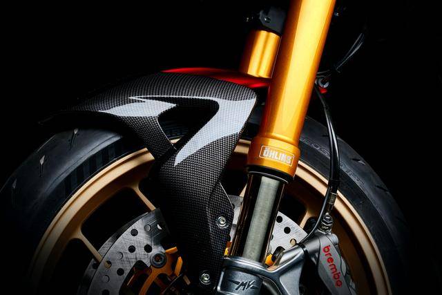 5、標(biāo)配了高規(guī)格的 Ohlins 奧林斯懸掛系統(tǒng),前面是叉芯口徑為 43 mm、行程為 120 mm 的 NIX 30 倒立式前叉,后面是行程為 133 mm 的 TTX GP 36 減震;制動(dòng)系統(tǒng)采用了 Brembo 布雷博的配套,前面是雙 320 mm 剎車碟 + Hypure 剎車卡鉗,后面是 220 mm 單剎車碟;廠方稱,新車的全身配置,將尖端技術(shù)與情感表現(xiàn)融為了一體;