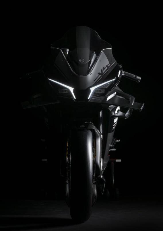據(jù)官方信息,V4 SR-RR原型車在技術(shù)層面,以極致性能為絕對導(dǎo)向:搭載了一臺排量997cc的90°V型四缸發(fā)動(dòng)機(jī),強(qiáng)悍“心臟”爆發(fā)出157kW(超210匹)的最大功率,WPR率(干重/馬力)達(dá)到0.86 kg/hp(整車干重約180kg)。該發(fā)動(dòng)機(jī)融具備寬廣、線性的功率曲線,能夠以平順而漸進(jìn)的方式輸出強(qiáng)勁動(dòng)力,充分釋放V4平臺潛力。獨(dú)特的點(diǎn)火順序賦予V4獨(dú)特聲浪與即時(shí)油門響應(yīng),并帶來獨(dú)一無二的騎行體驗(yàn)。整車標(biāo)配Akrapovi?全鈦排氣系統(tǒng),符合歐五+排放標(biāo)準(zhǔn)。該排氣系統(tǒng)與發(fā)動(dòng)機(jī)特性完美匹配,釋放出兼具機(jī)械質(zhì)感與侵略性的獨(dú)特聲浪。