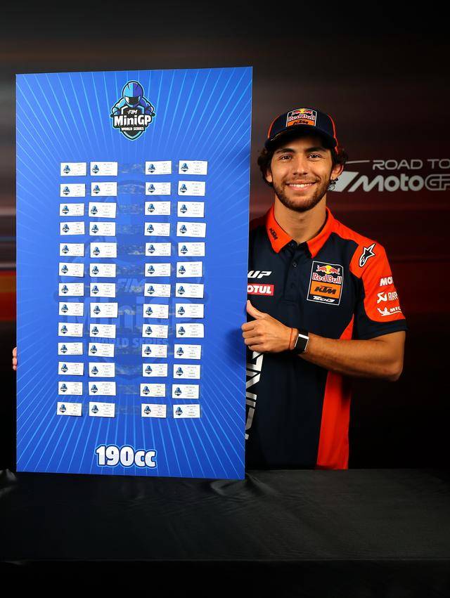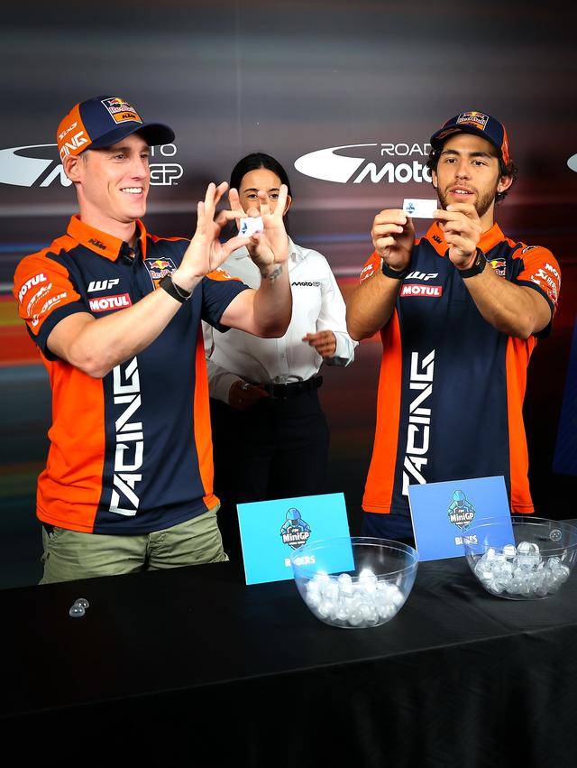 下面的圖片,十月 3 日舉行的 MotoGP 馬來西亞站期間,由兩位 MotoGP 車手巴斯塔尼尼(Enea Bastianini)和小 E(Pol Espargaro,艾斯帕加羅),提前替小車手們、為這場年度總決賽進行了車號抽簽。