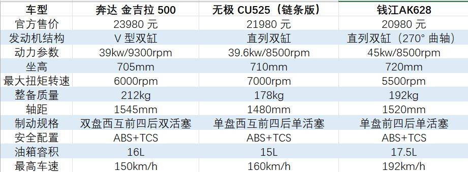市場分析目前主流的500級巡航車型多如過江之卿,各個廠家紛紛推出自家的品牌車型,按照銷量來看目前較為火熱的代表車型,以主打年輕運動的CU525,及引領(lǐng)巡航浪潮的金吉拉500為主,作為錢江品牌的首款中大排車型-AK628,競爭力表現(xiàn)如何,咱們一圖看清楚。金吉拉500作為金吉拉系列的延伸作品,三車中最長軸距帶來良好的高速穩(wěn)定性,同時整車的尺寸以及氣場都是大型巡航的風格,價格也是最高的;CU525近期推出的鏈條版也是與時俱進的將價格定在了21980,價格很驚喜。三車的減震都是無品牌,金吉拉500(雙盤)和CU525(單盤)的剎車都是西互,AK628則是錢江牌。但要論價格驚喜,相信沒有哪個廠家能有錢江有魄力,從上市之初的25980元,直降5000,來到了20980元的驚人價位,從車型定位上也不難看出,AK628實際排量554cc,屬性與CU525更接近,同樣屬于運動巡航的級別,但AK628這個AK,個人以為就是PK的意思,真刀真槍的肉搏戰(zhàn),用三車中最大的動力,同時270度曲軸夾角不僅在低扭表現(xiàn)上出色,同時接近于V型雙缸的聲浪表現(xiàn),更能有效的對引擎控制進行抑制,可謂一石二鳥,1520mm的軸距不僅在高速穩(wěn)定性上表現(xiàn)可圈可點,日常通勤使用也是壓力驟減,17.5L同級最大的油箱即使摩旅也是毫無壓力,幾個點相結(jié)合這也是AK628敢定在這個價格的原因,競爭力非常大,只是缺少一些知名度。摩托財智,贊10