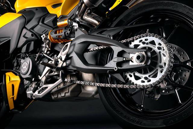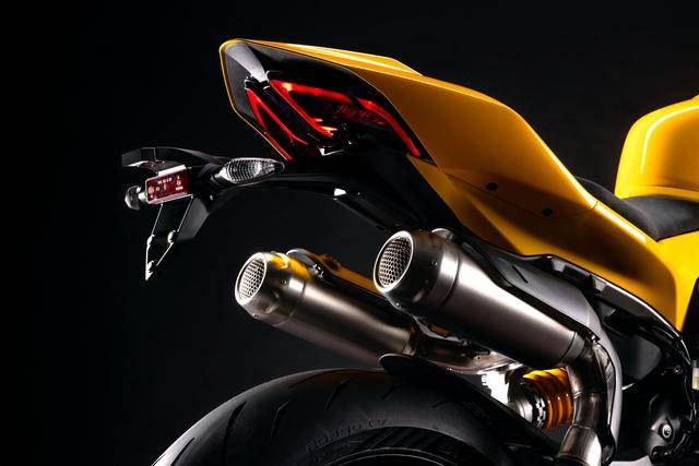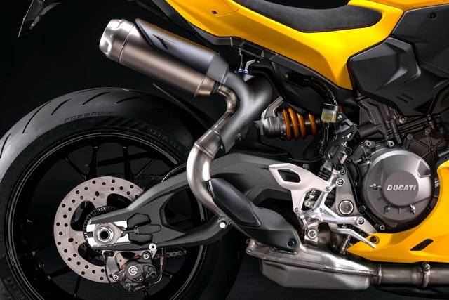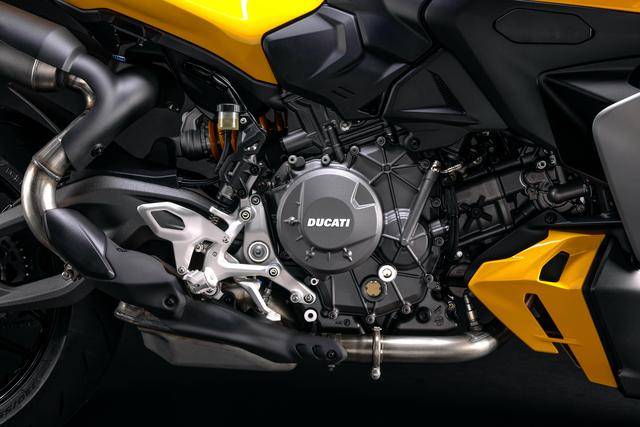 現(xiàn)行的 2025 Panigale V2 跑車搭載一副全新開發(fā)水冷四沖程 V 型 90 度兩氣缸、DOHC每氣缸四氣閥,帶 IVT 可變進氣閥正時控制的發(fā)動機,缸徑、行程為 96 mm x 61.5 mm,排氣量 890 cc,最大動力輸出 88 kw(約 120 匹)。面向賽道的應(yīng)用,廠方同步推出了原廠的賽車排氣系統(tǒng),換裝之后的峰值馬力輸出提高至 126 匹,重量也進一步再降低 4.5 公斤。