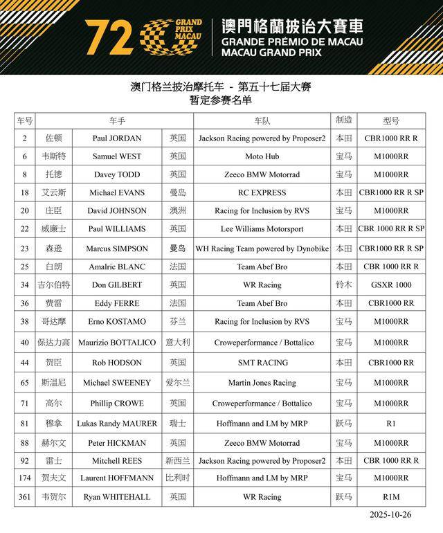 有二十位車手參加 2025 澳門 GP 的角逐,其中騎乘寶馬賽車的車手有九人,使用 Honda 賽車的有八人,使用 Yamaha 賽車的車手有兩人、Suzuki 賽車有一人。參賽車手中,焦點(diǎn)包括了駕駛 88 號(hào)賽車、來自英國(guó)的澳門 GP 三屆冠軍赫爾文(Peter Hickman);赫爾文的隊(duì)友,駕駛 8 號(hào)車、同樣來自英國(guó)的托德(Davey John Todd),今年氣勢(shì)正旺的他,此前奪得了 2025 人島 TT(Isle of Man TT)最高級(jí)別 Superbike TT 的冠軍,他同時(shí)也是澳門 GP 去年的冠軍;此外,還有38 號(hào)車、2022 年的冠軍、來自芬蘭的哥達(dá)摩(Erno Kostamo)等。