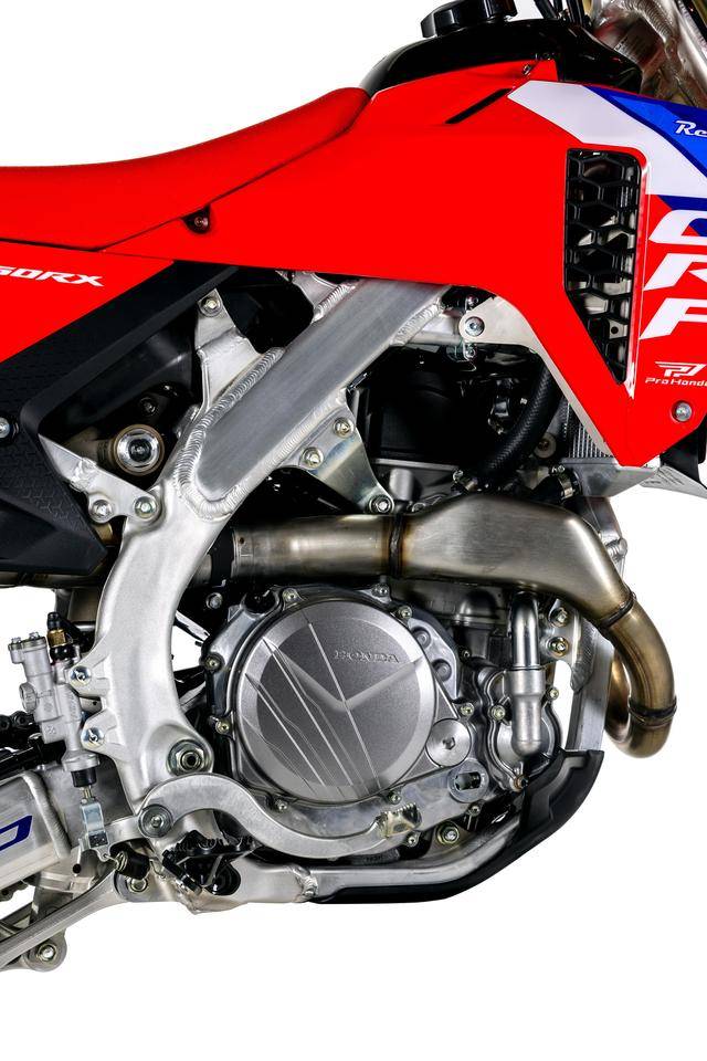 2026 CRF 450RX Supermoto 搭載一副與市售越野賽車 CRF450R 同平臺的水冷四沖程單汽缸、SOHC(Unicam)四汽閥的發(fā)動機,缸徑、行程為 96 mm x 62.1mm,排氣量 449.7 cc,五檔的變速齒輪箱。廠方未公布該車的最大動力輸出,而這一級別車型、普遍的峰值馬力輸出是 60 匹以上。