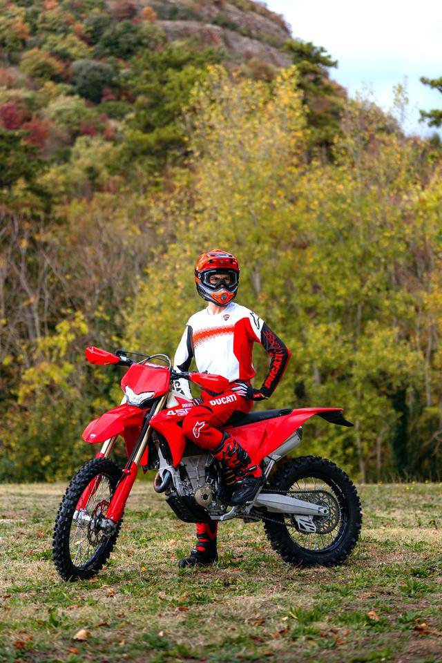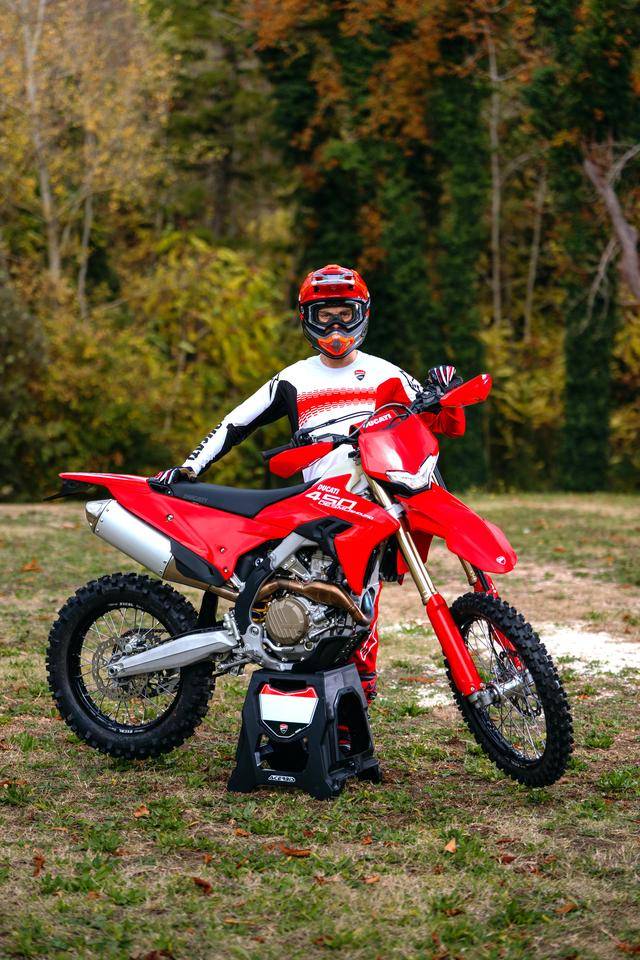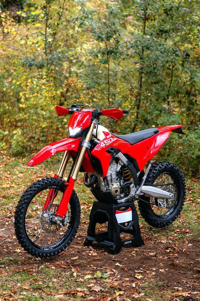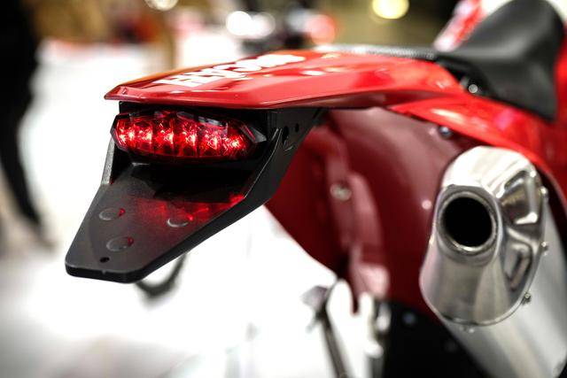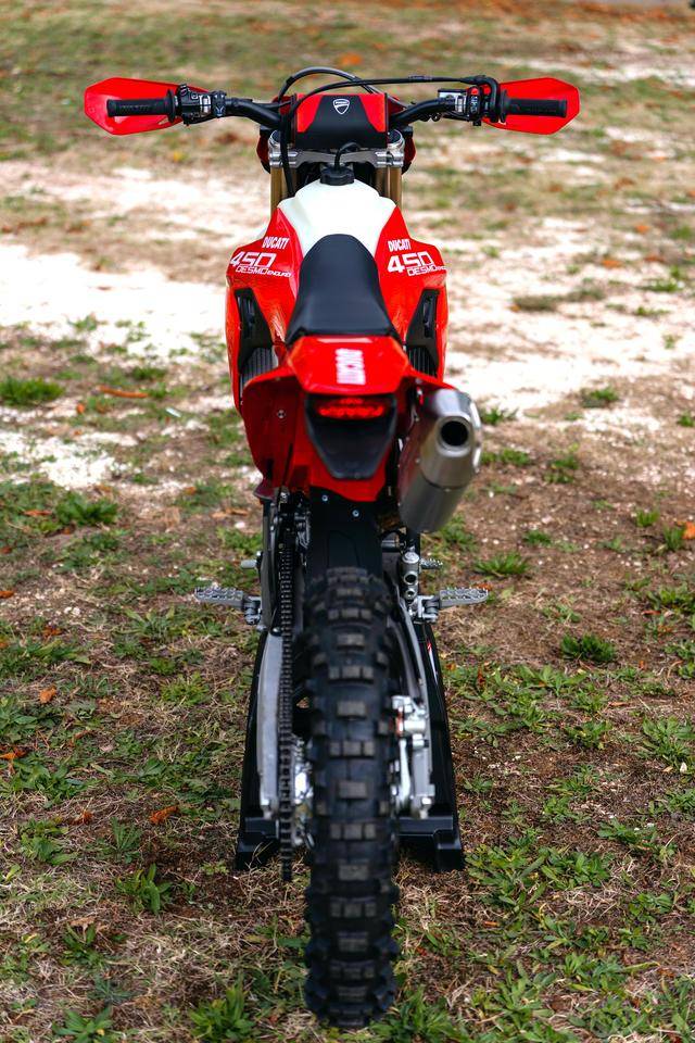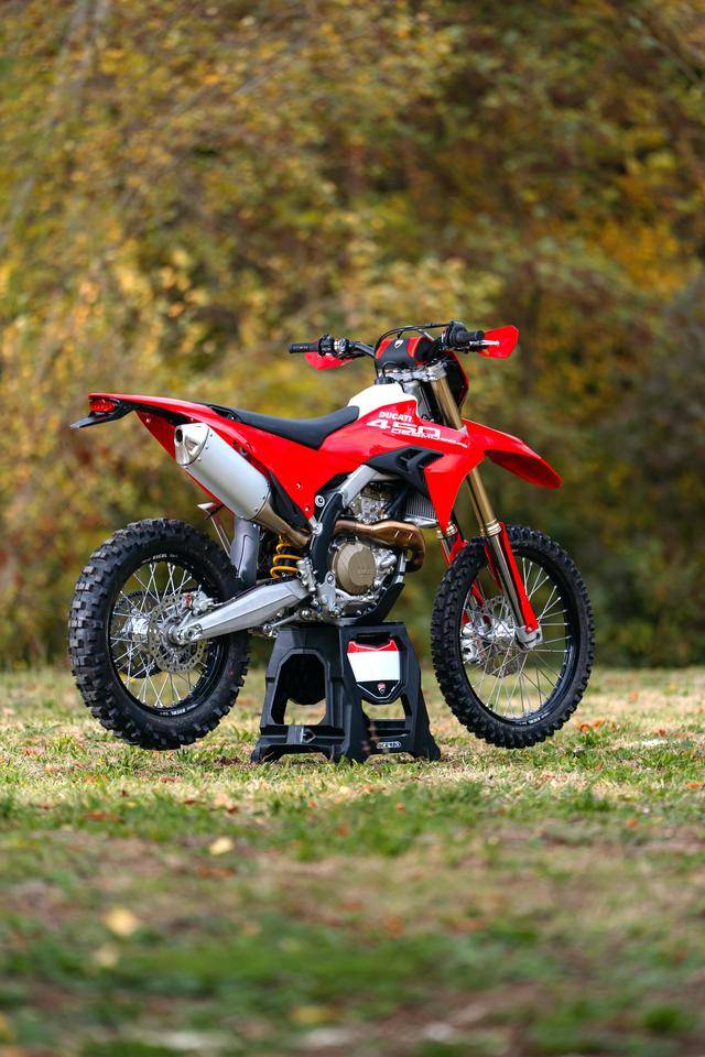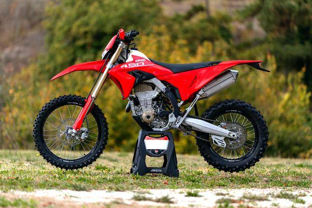 杜卡迪在今年四月正式發(fā)布了屬于 MX(Motocross,場(chǎng)地越野)規(guī)格的全新市售越野賽車(chē) Desmo450 MX,這是杜卡迪歷史上的第一款市售越野賽車(chē)。市售規(guī)格的 Desmo450 MX 搭載一副水冷四沖程單氣缸、DOHC 四氣閥、Desmodromic 氣閥正時(shí)控制(軸控制氣閥,而常見(jiàn)的氣閥開(kāi)合控制組件是彈簧)的發(fā)動(dòng)機(jī),缸徑、行程為 96 mm x 62.1 mm,排氣量 449.6 cc,峰值動(dòng)力輸出 46.7 kw(約 63.5 匹)/9400 rpm,最大扭矩輸出 53.5 N.m/7500 rpm。