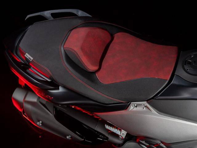 TMAX的騎行體驗(yàn)一直被譽(yù)為運(yùn)動(dòng)與舒適的完美平衡。寬大的腳踏區(qū)提升了騎行舒展性,紅色雙人坐墊配備可調(diào)節(jié)腰靠,長(zhǎng)時(shí)間騎行也不易疲勞。座桶空間足以容納一頂全盔,滿(mǎn)足日常儲(chǔ)物需求。操控性一直是TMAX的強(qiáng)項(xiàng)。輕質(zhì)鋁制雙翼梁車(chē)架直接承載發(fā)動(dòng)機(jī),提升了底盤(pán)剛性與操控精度。長(zhǎng)鋁制后搖臂增強(qiáng)了高速穩(wěn)定性,1575mm的軸距則兼顧了靈活性與平穩(wěn)性。減震系統(tǒng)采用41mm SHOWA SFF-CA倒置前叉,后懸架采用多連桿結(jié)構(gòu)中置減震,支持多段預(yù)載調(diào)節(jié)。剎車(chē)系統(tǒng)采用前后盤(pán)剎,前267mm雙制動(dòng)盤(pán)配對(duì)向四活塞卡鉗,后282mm單盤(pán)配單活塞卡鉗,搭配雙通道ABS制動(dòng)系統(tǒng)。標(biāo)配D-MODE騎行模式、牽引力控制系統(tǒng)等配置,提升復(fù)雜路況下的安全性。