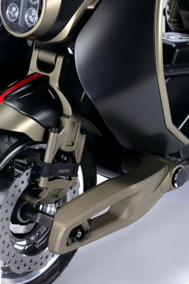 3、新的這套 DLAS 系統(tǒng)通過帶有下?lián)u臂的剪式連桿機(jī)構(gòu)去提高轉(zhuǎn)向精度,此連桿機(jī)構(gòu)同時(shí)集成了前輪軸和前剎車卡鉗的固定支架,新設(shè)計(jì)可以通過調(diào)節(jié)減震器(該減震器的標(biāo)準(zhǔn)行程為 90 mm),讓騎士既可以選擇在較高剛性的、偏向運(yùn)動(dòng)化的設(shè)置,也能夠采用更柔軟、傾向舒適響應(yīng)的設(shè)定;該設(shè)計(jì)的好處,是在不影響乘坐舒適性的情況下實(shí)現(xiàn)了良好的轉(zhuǎn)彎精度;