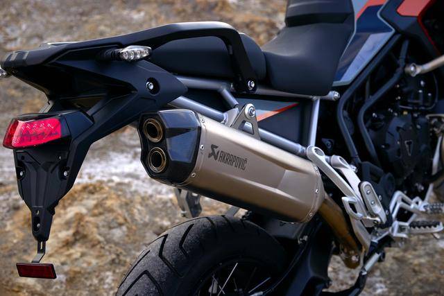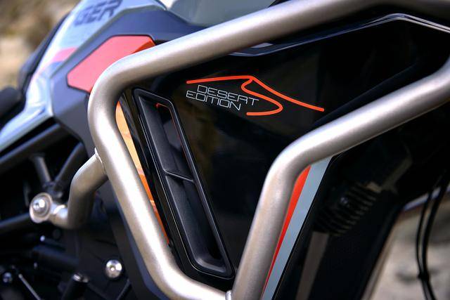 * 與 Rally Pro 版相比,新的 Tiger 900 Desert 沙漠版同樣標(biāo)配了 Akrapovic 阿克拉波維奇的排氣管,車身的前部加裝了全套的兩側(cè)護(hù)架,采用了一個(gè)專屬的車身圖案。