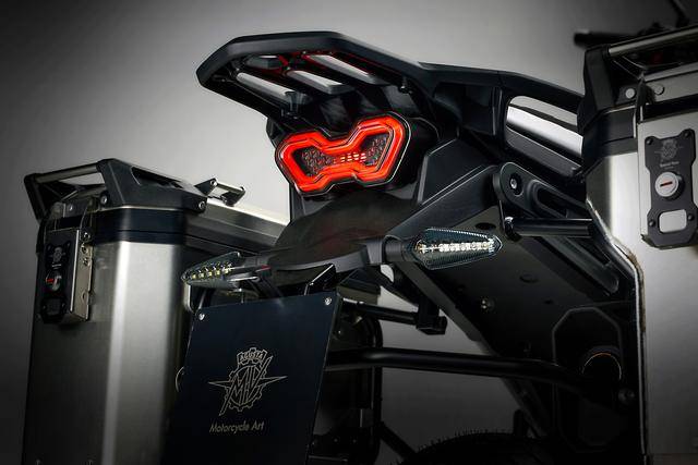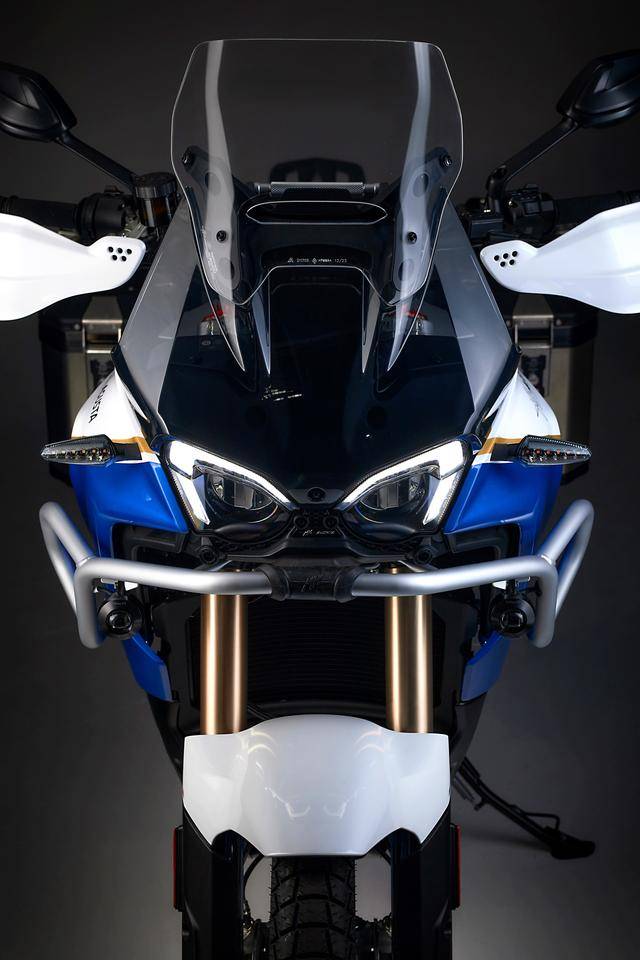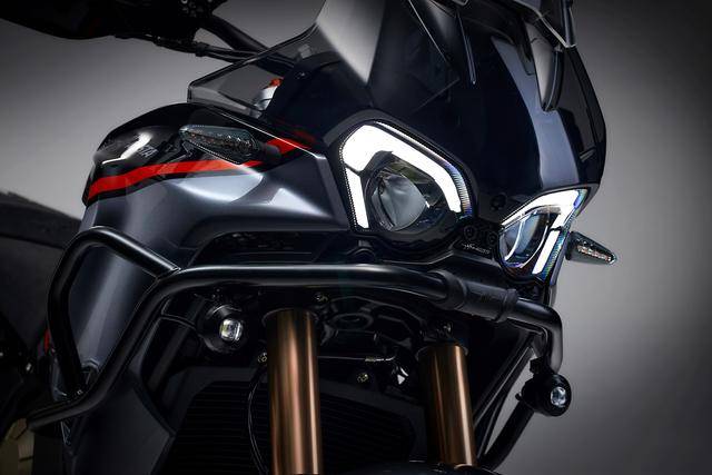 3、探險(xiǎn)車風(fēng)格的外觀造型,車頭前部整流罩經(jīng)過(guò)空氣動(dòng)力學(xué)測(cè)試,與前風(fēng)擋的配合之下,可以有效降低高速之下、迎面氣流對(duì)騎士的影響;標(biāo)配了一個(gè) 7 英寸的大型 TFT 全彩色數(shù)字式儀表板,全 LED 的燈光系統(tǒng),容量為 20 公升的油箱,鞍座具有兩個(gè)高度(850 mm 和 870 mm)可調(diào),離地間隙 230 mm,除燃油外、全車整備重量 239.7 公斤;