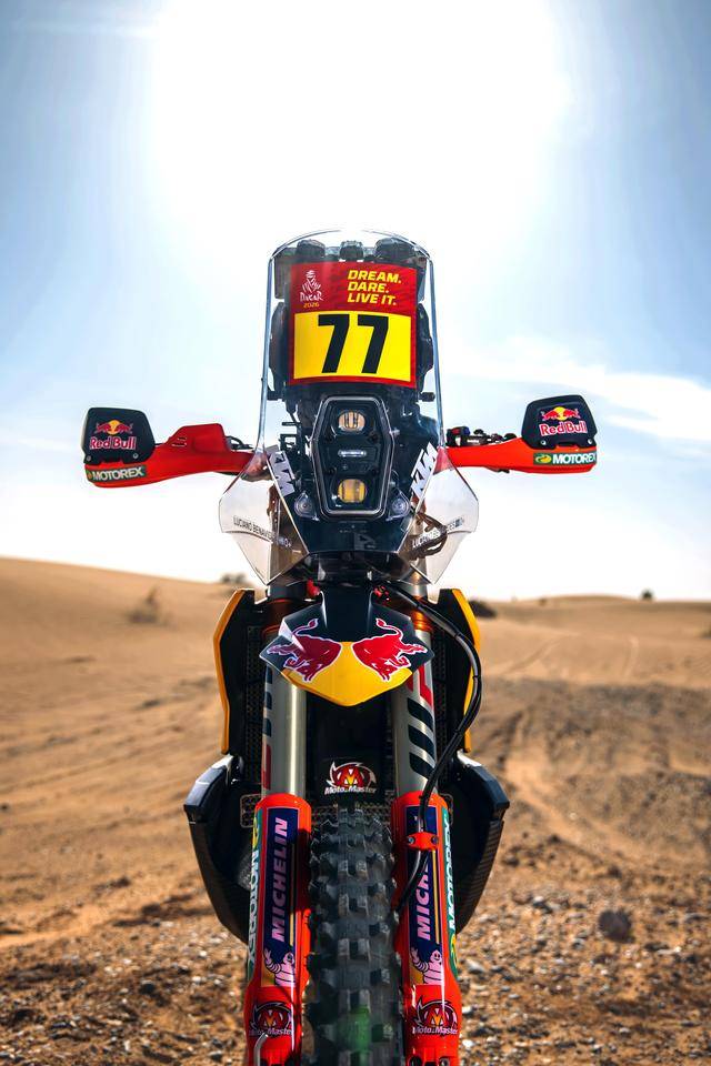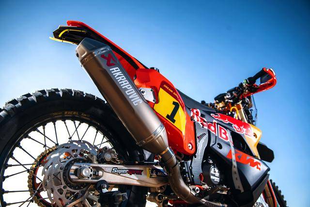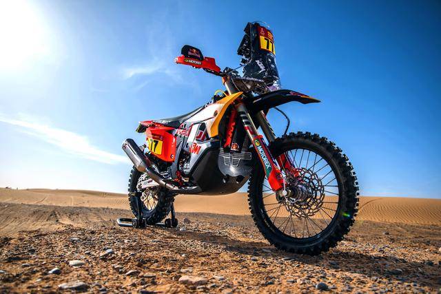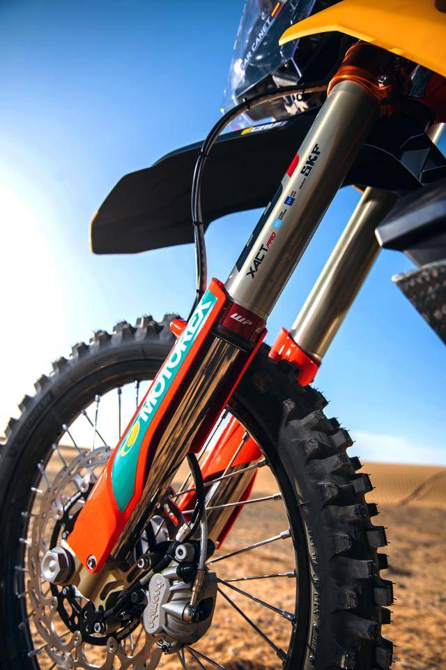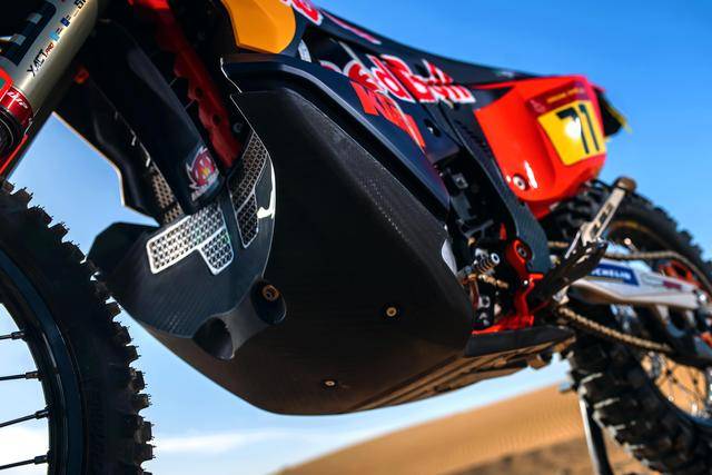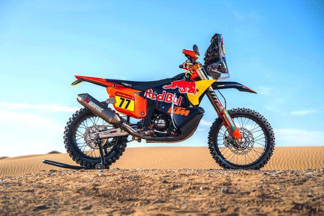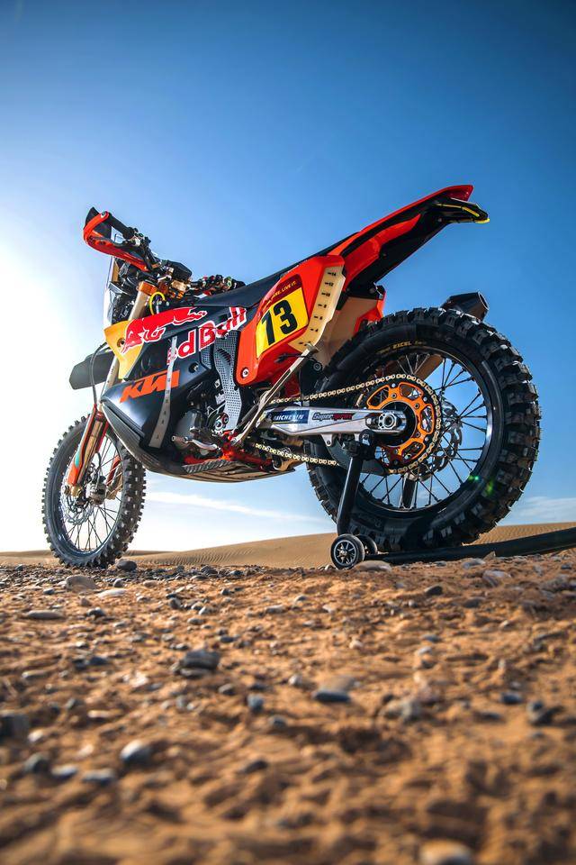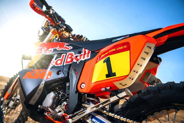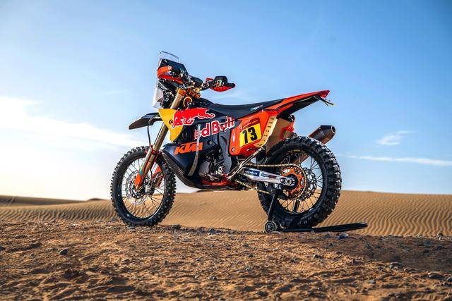 KTM 的拉力工廠賽車是 KTM 450 Rally,該車基于 MX 場地越野賽車 450 SX-F 經(jīng)大幅修改而成,搭載一副水冷四沖程單氣缸的發(fā)動機(jī),經(jīng)過賽車部門特制的、針對拉力賽特性的氣缸蓋鈦合金制的氣閥,經(jīng)過強(qiáng)化的離合器、以及特制的六檔變速齒輪箱;車體方面,采用一副專為拉力賽設(shè)計的鋼制車架,WP 配套的賽車懸掛系統(tǒng);全車配備了三個可獨(dú)立供油的油箱,總的燃料攜帶量為 35 公升。