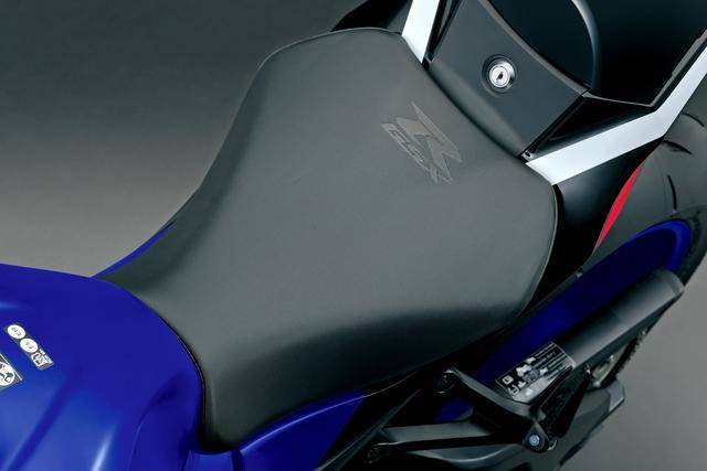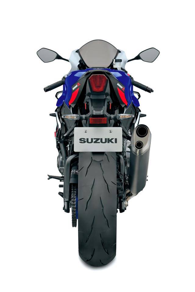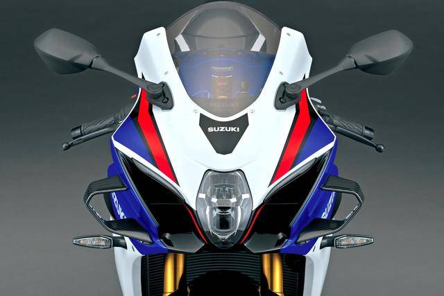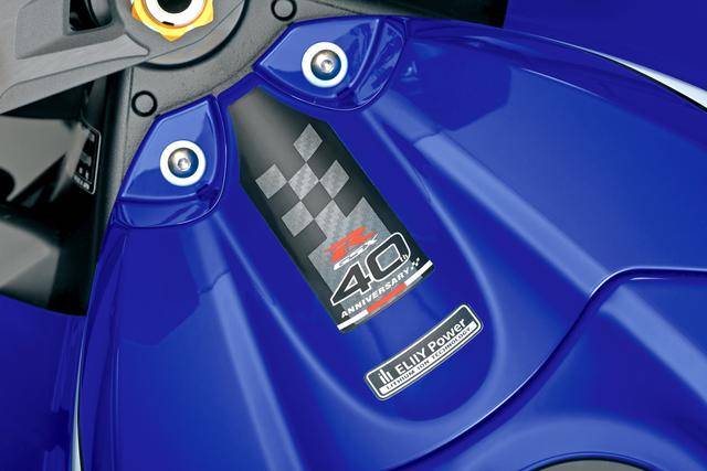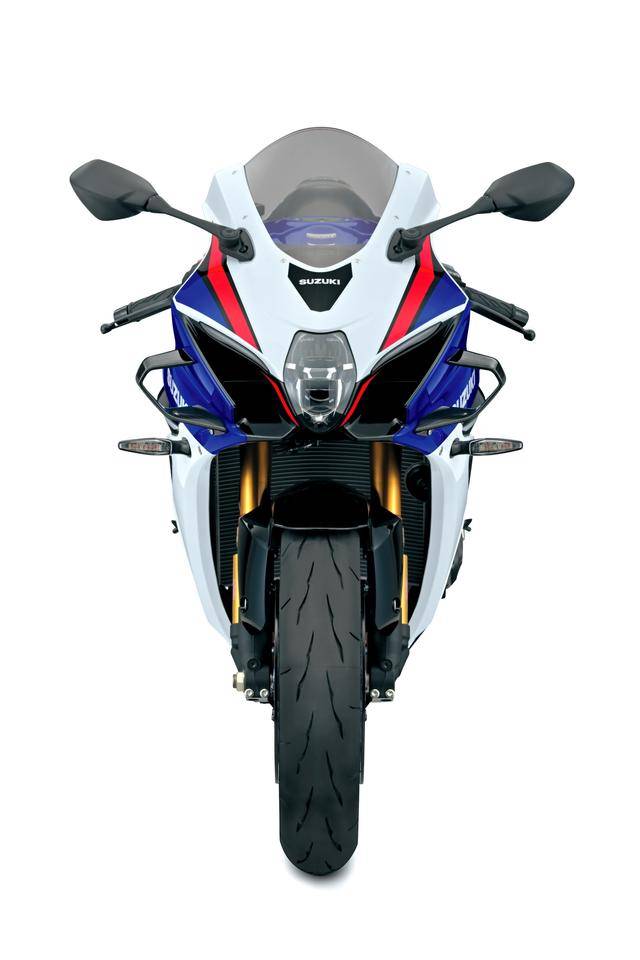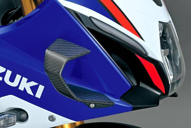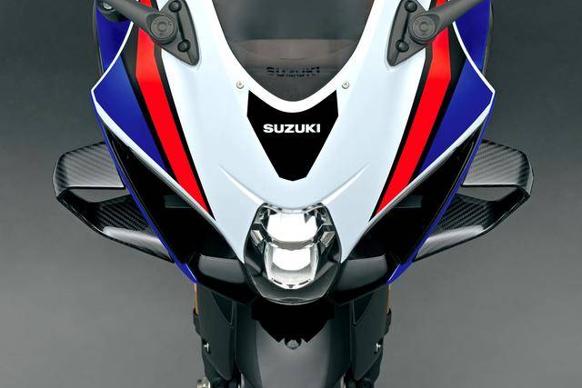 7、外觀(guān)造型方面,GSX-R 標(biāo)志性的 SRAD(Suzuki Ram Air Direct,直接沖壓進(jìn)氣)車(chē)頭設(shè)計(jì)獲得了保留;變化的焦點(diǎn)是前部整流罩增加了定風(fēng)翼,前部整流罩下方的左右兩側(cè)都略作修改(右下側(cè)整流罩有著更大凹口,而左下側(cè)整流罩原有的開(kāi)口、現(xiàn)在已經(jīng)被取消)、以匹配新的消聲器布局;車(chē)身多處有四十周年紀(jì)念的貼花;此外,一體式設(shè)計(jì)的后擋泥板和后牌照掛架也經(jīng)過(guò)修改;