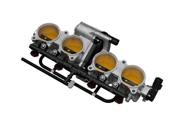 4、動(dòng)力單元的外部配套,電子燃油噴注系統(tǒng)、換裝了更大口徑的節(jié)氣閥(從原來(lái)的 46 mm 換成現(xiàn)在的 48 mm);雙噴咀設(shè)計(jì)(一個(gè)作為主噴咀,另一個(gè)作為高轉(zhuǎn)速之下才工作的輔助噴咀)的 S-TFI(Suzuki Top Feed Injectors,頂置式噴咀。即輔助噴咀位于進(jìn)氣歧管的上方)系統(tǒng),輔助噴咀的噴霧模式經(jīng)過(guò)了改進(jìn),以提高燃燒效率、節(jié)氣閥的響應(yīng)和峰值功率;主噴咀則將之前的十孔設(shè)計(jì)、換成了現(xiàn)在八孔的設(shè)計(jì);整個(gè)電噴系統(tǒng)的修改有助于新車(chē)達(dá)到歐 5 + 排放標(biāo)準(zhǔn);