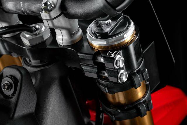 4、換裝了 Ergal 配套的上下三星(前叉三角臺(tái)),該組件的表面采用了黑色陽(yáng)極氧化處理(標(biāo)準(zhǔn)款采用鋁合金原色的銀灰色),重量也比標(biāo)準(zhǔn)款的同組件降低了大約 200 克;