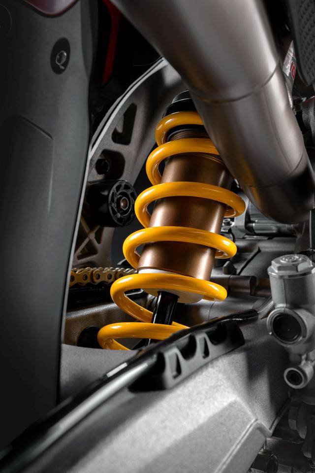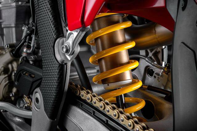 3、與標(biāo)準(zhǔn)款相同的、重量只有 8.95 公斤的鋁合金制雙翼樑車(chē)架,鋁合金制的后搖臂;工廠版在車(chē)架/底盤(pán)的標(biāo)志性變化,是換裝了與 Showa 共同開(kāi)發(fā)的、具有更強(qiáng)性能的前后懸掛系統(tǒng):前 310 mm、后 301 mm 的懸掛標(biāo)準(zhǔn)行程保持不變,前面是叉芯口徑為 49 mm 的倒立式前叉,后單筒式的后減震,均有著全可調(diào)功能,前叉芯、后減震器桿都采用了氧化鈦處理和超精加工、令表面強(qiáng)度提高了大約 60%,從而提高了懸掛系統(tǒng)的耐磨性和通過(guò)礫碎石路面時(shí)的抗損性;而采用了特殊表面涂層的叉芯和減震桿,強(qiáng)化了對(duì)顛簸的處理、以提高操控的平穩(wěn)性;