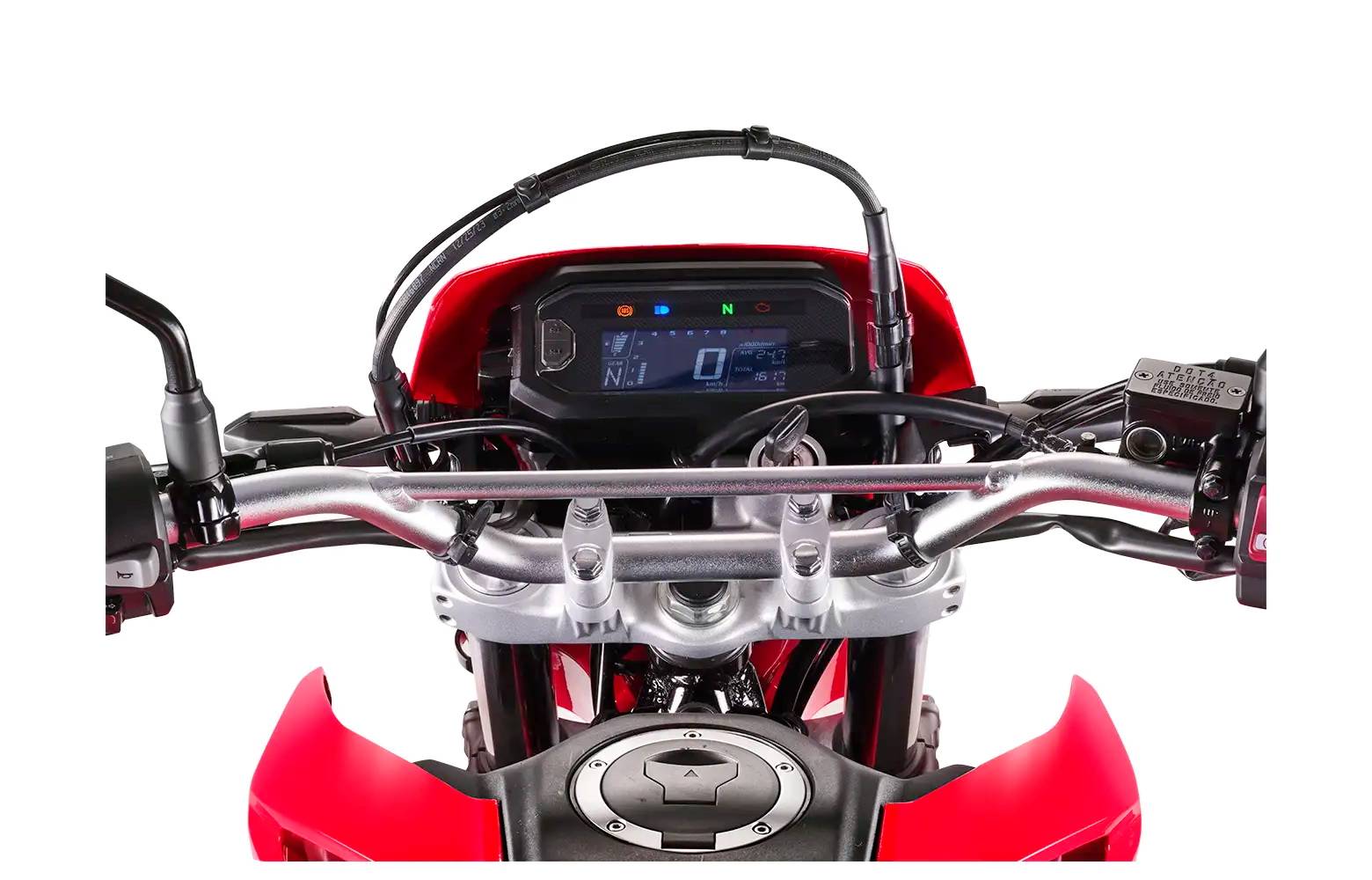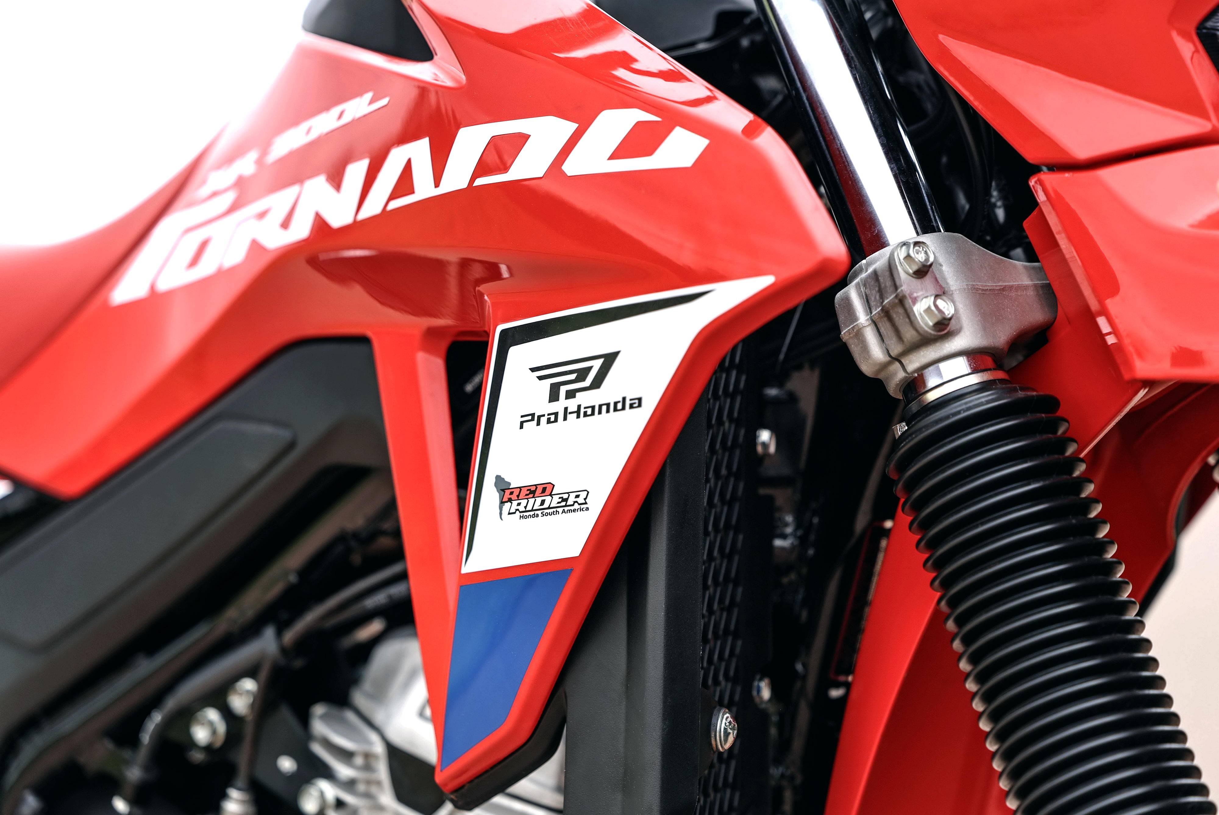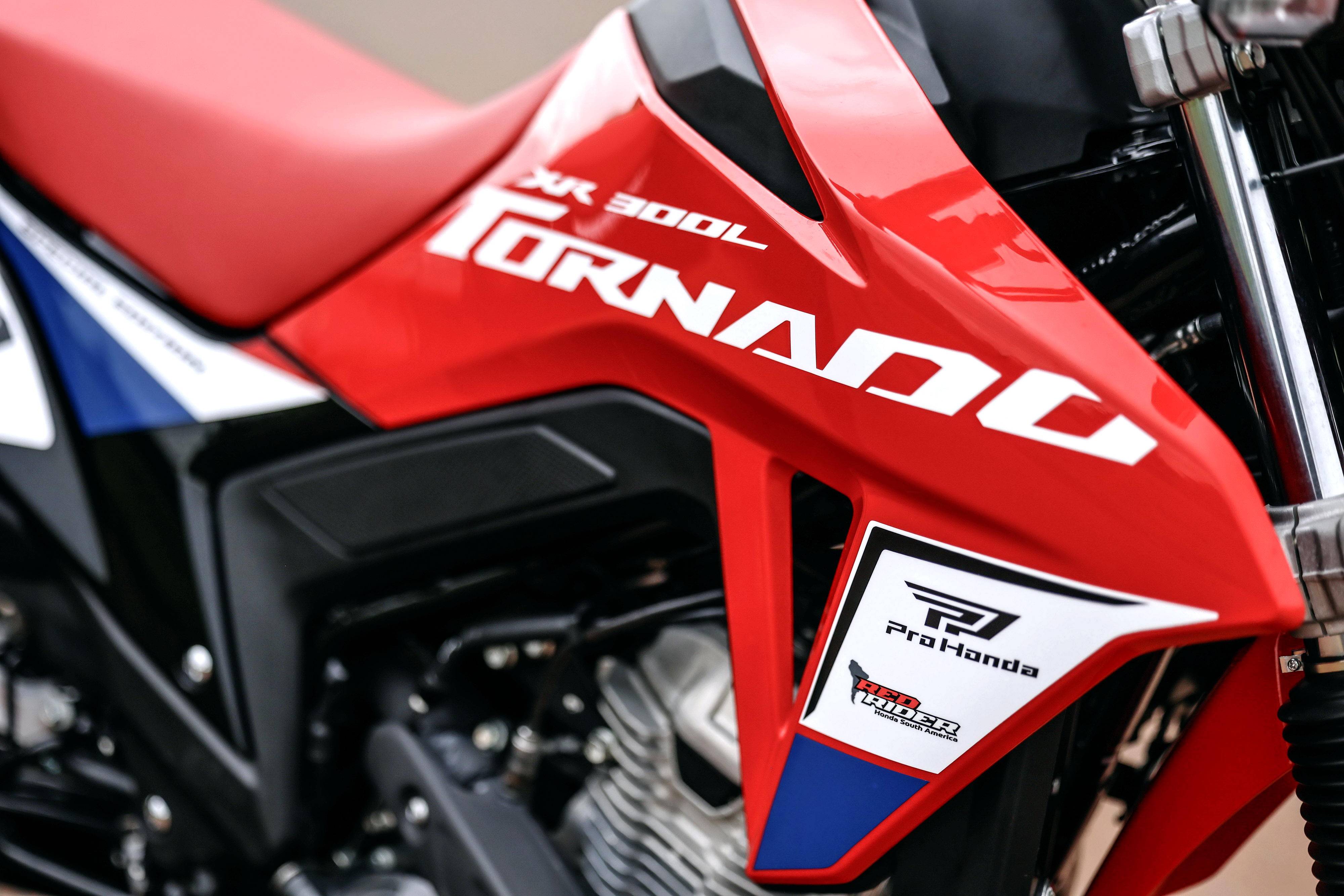 與標(biāo)準(zhǔn)款相比,2026 XR300L Tornado “ 龍卷風(fēng) ” 特別版主要的變化是車身圖案/貼花:采用了一個名為 Fighting Red “ 戰(zhàn)斗紅 ” 的車身貼花,這是充滿 Honda 傳統(tǒng)風(fēng)格的三色調(diào);油箱的兩側(cè),貼有 Pro Honda(Honda 在當(dāng)?shù)氐臐櫥推放疲┖?Red Rider(Honda 在美洲多地舉辦的賽道體驗(yàn)活動名稱)的標(biāo)志。