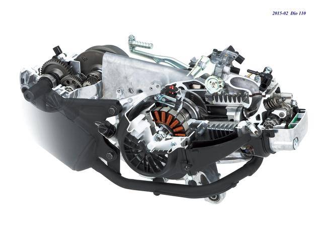 14、在 2015 年二月,廠方向本土市場推出了第二代的、由 Honda 越南公司生產(chǎn)的 Dio 110(JF58),該車搭載一副編號為 JF58E 的風(fēng)冷四沖程單氣缸、排氣量 108 cc(缸徑、行程為 50 mm x 55.1 mm)的發(fā)動機(jī);