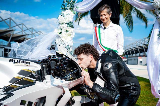 作為此前承諾(若貝澤奇能夠拿到三個(gè)或以上的分站冠軍)的一部分,阿普利亞向貝澤奇贈(zèng)送了一輛 RS-GP 賽車。為此雙方舉行了一場(chǎng) “ 婚禮 ” 式的交付贈(zèng)送儀式,貝澤奇將這輛賽車稱為 RS-GP Albarosa,并將其當(dāng)成 “ 伴侶 ” 而發(fā)表了一份 “ 互愛(ài) ” 的宣言。