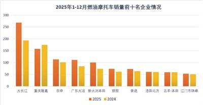 企業(yè)出口集中度較高。2025年1-12月,出口量排名前十位的企業(yè)合計(jì)出口821.25萬(wàn)輛,占摩托車出口總量的61.44%。大長(zhǎng)江、隆鑫、廣東大冶等頭部企業(yè)繼續(xù)引領(lǐng)出口增長(zhǎng),展現(xiàn)出我國(guó)摩托車產(chǎn)業(yè)在全球化競(jìng)爭(zhēng)中的集群優(yōu)勢(shì)。
