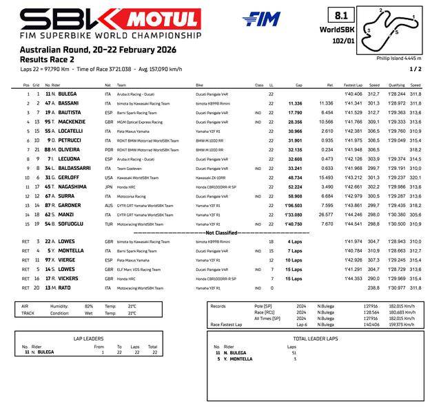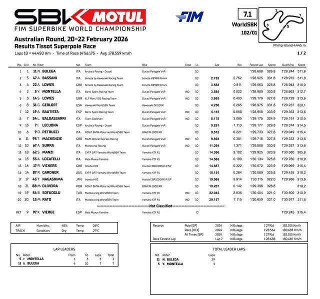賽程為 10 圈的 Superpole Race 超級(jí)排位賽正賽,布雷加在經(jīng)歷前幾圈的混戰(zhàn)之后,到第 4 圈回到了領(lǐng)先的位置上,最終以接近 3 秒的優(yōu)勢(shì)奪得了第一;Bimota 比摩塔工廠車(chē)隊(duì)的兩位車(chē)手也跟上了節(jié)奏,駕駛 47 號(hào)車(chē)的意大利車(chē)手巴薩尼(Axel Bassani)奪得了第二,他的隊(duì)友隊(duì)友、駕駛 22 號(hào)車(chē)的英國(guó)車(chē)手 A.洛維斯(Alex Lowes)拿到了第三。