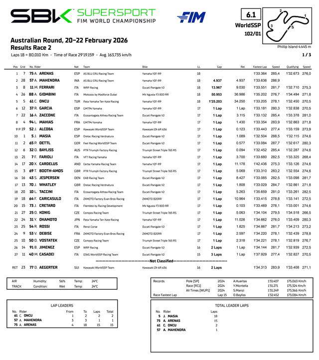周日進(jìn)行的 WorldSSP 第二節(jié)正賽、在濕地之下拉開帷幕,幾個發(fā)車前就裝上了干地輪胎、賭天氣會好轉(zhuǎn)的車手,免去了進(jìn)站更換輪胎的時間損耗,成為了這場 18 圈之較量中的贏家。一開始就以干地輪胎登場、駕駛 75 號車的西班牙車手阿里納斯(Albert Arenas),最終率先沖線拿到了勝利。這位 2020 年的 Moto3 世界冠軍、去年仍在 Moto2 級別,2026 賽季首次來到 WorldSSP、就在這場揭幕戰(zhàn)拿到了他在該級別的首個冠軍。