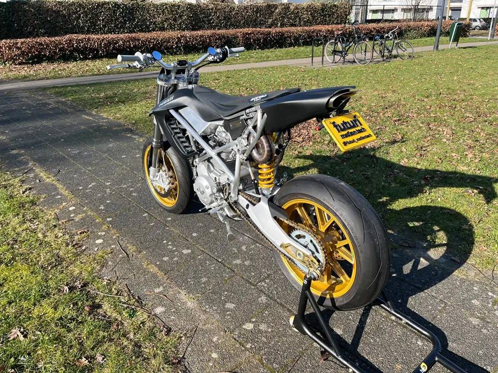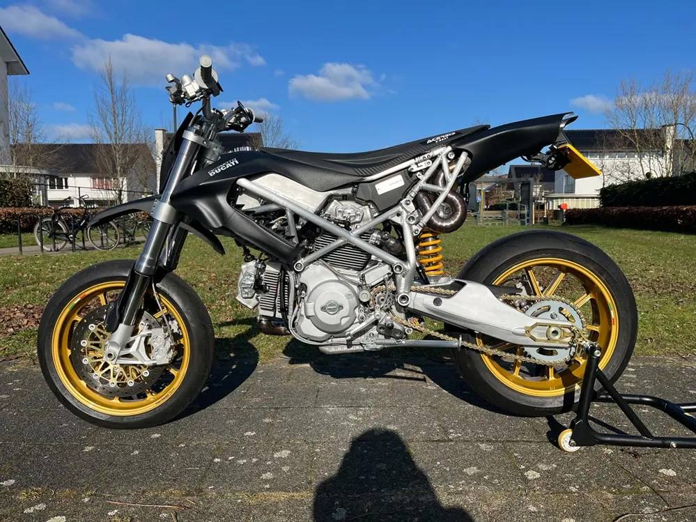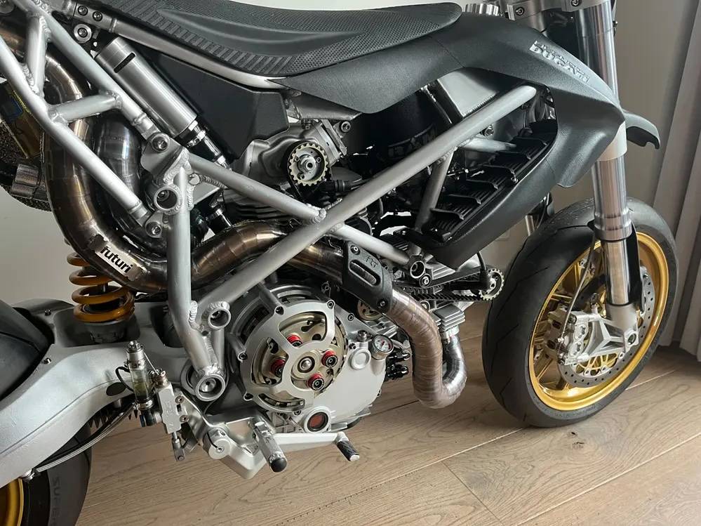 動(dòng)力核心植入 Multistrada 1100 的 V 缸引擎,換上輕量化曲軸、賽車凸輪軸并流用 1098 仿賽變速箱。 底盤采用全新鋁合金車架搭配初代999雙搖臂、Hypermotard 1100前叉,后方更搭載具備自制電子阻尼調(diào)整的Öhlins避震,并配備17寸Marchesini鍛造鎂合金輪框。
