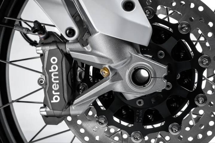 在制動系統(tǒng)上,2026 款進(jìn)行了一個很有趣的變動,前煞車盤直徑從原先的 320mm 縮小到了 305mm,雖然尺寸縮水,但搭配 Brembo M4.32 一體式卡鉗與全新的直推總泵,反而換來了更好的手感回饋。