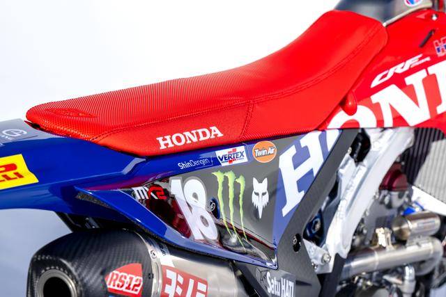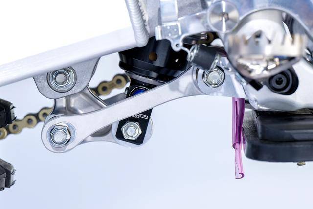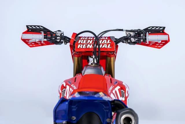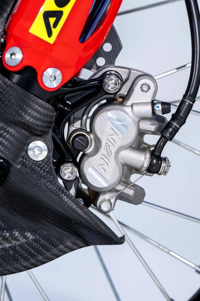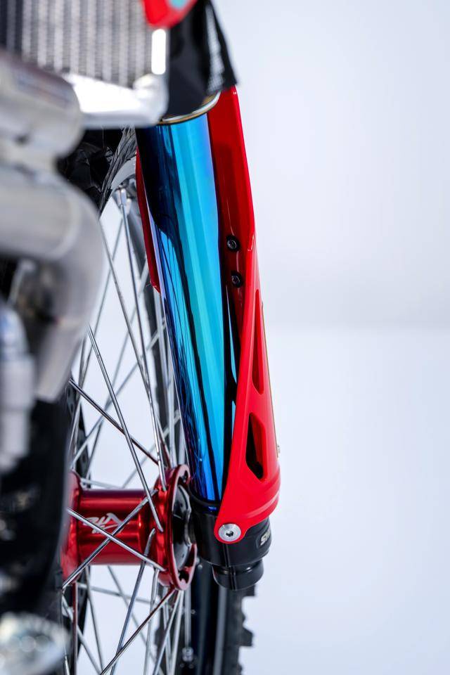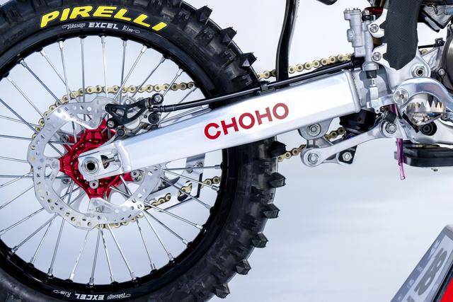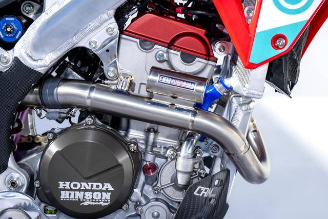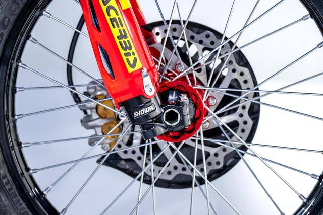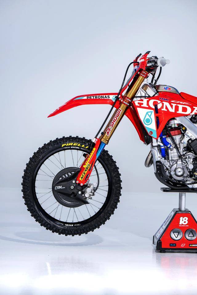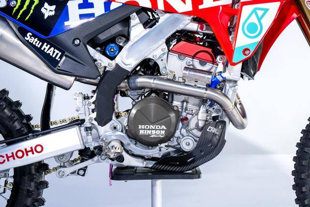 車體方面,采用一副與 CRF450R 同級的、增強了剛性的鋁合金車架,Hitachi Astemo 特制的、前叉芯帶有鈦涂層的 Showa 賽車懸掛系統(tǒng),Nissin 日信的剎車卡鉗,鍛造材料經(jīng) CNC 加工而成的上下三星(前叉三角臺)、前后輪轂等。