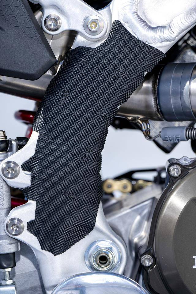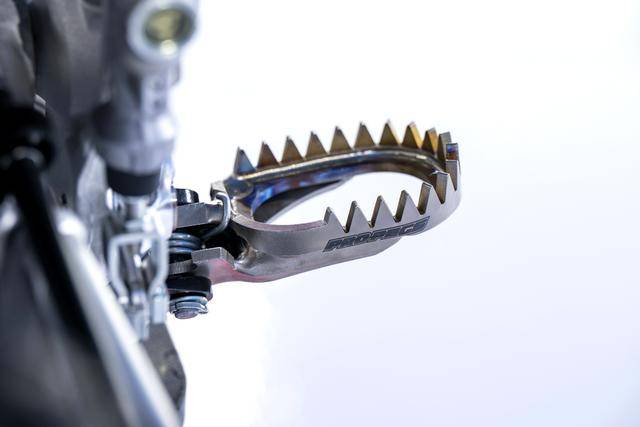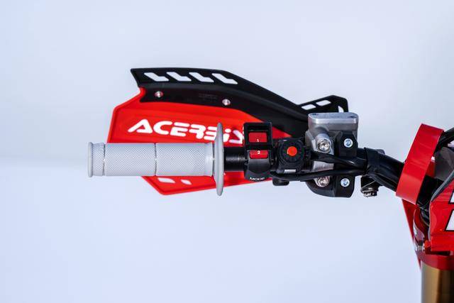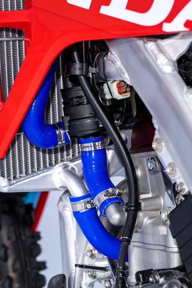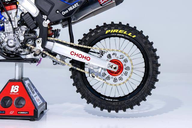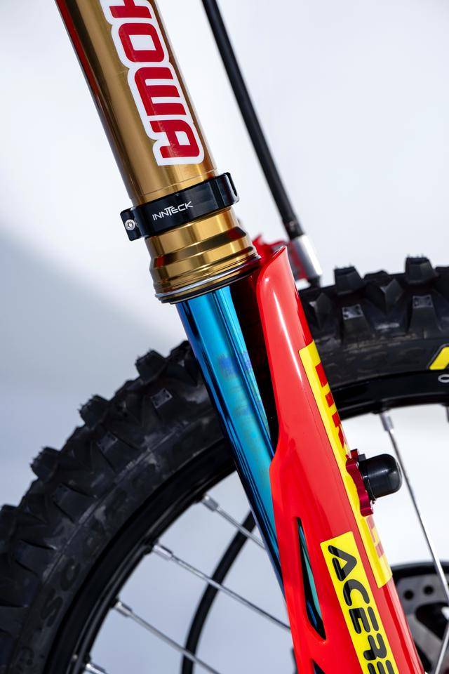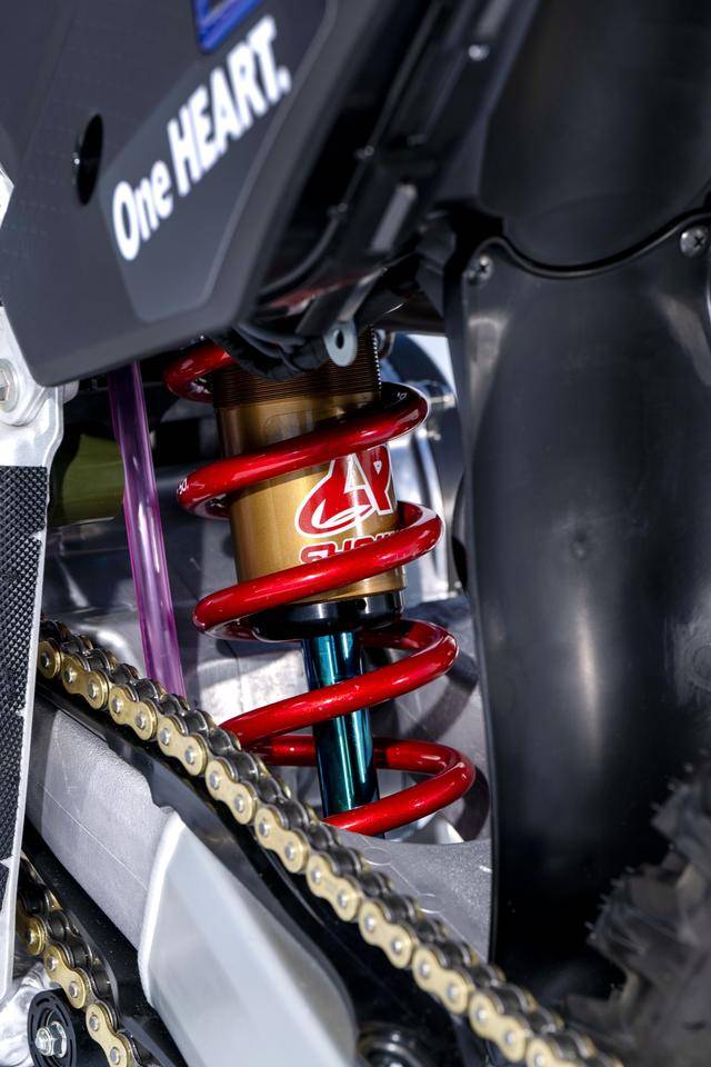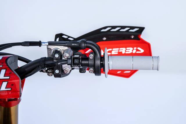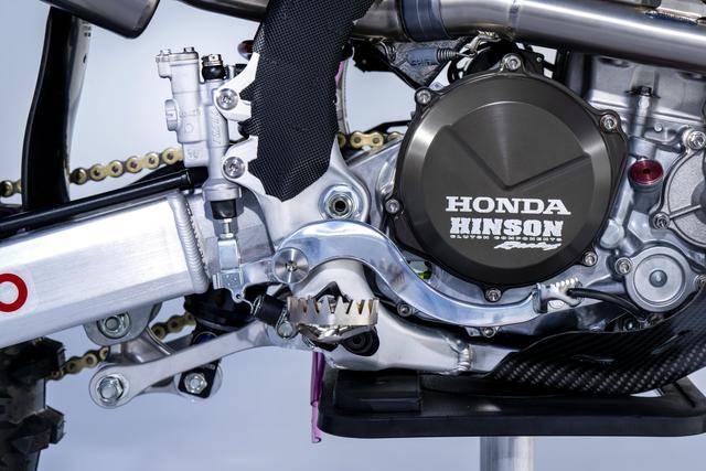 車體方面,采用一副與 CRF450R 同級的、增強了剛性的鋁合金車架,Hitachi Astemo 特制的、前叉芯帶有鈦涂層的 Showa 賽車懸掛系統(tǒng),Nissin 日信的剎車卡鉗,鍛造材料經(jīng) CNC 加工而成的上下三星(前叉三角臺)、前后輪轂等。