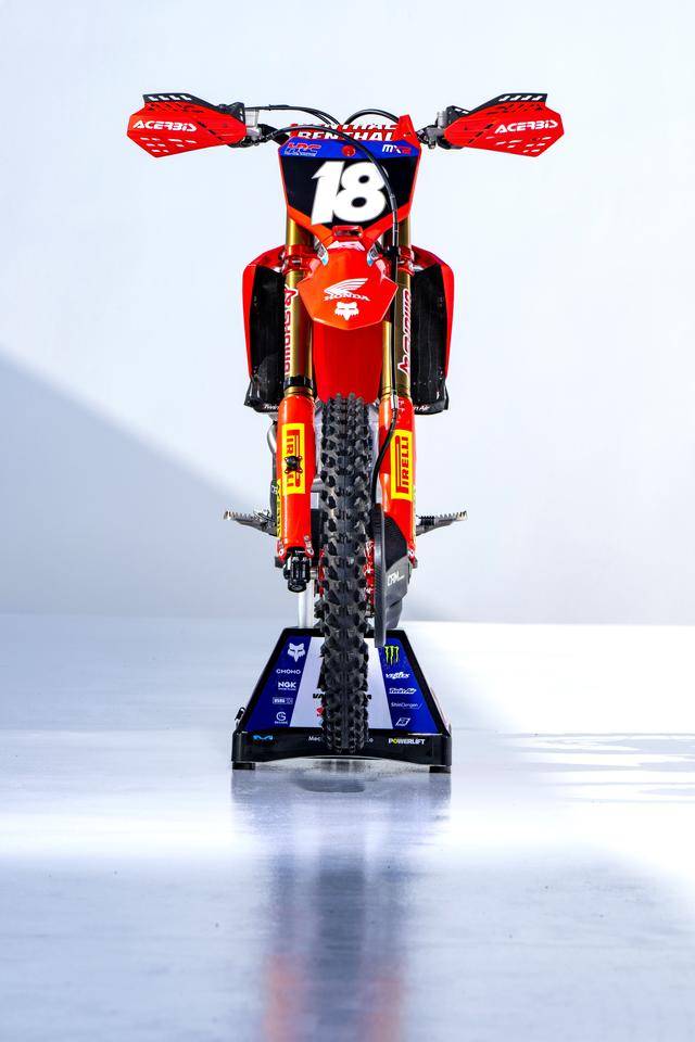 HRC 工廠車隊在 MX2 級別里采用的是 CRF250RW 工廠賽車,該車基于市售越野賽車 CRF250R 改造而成,搭載一副水冷四沖程單氣缸、DOHC 四氣閥的發(fā)動機,缸徑、行程為 79 mm x 50.9 mm,排氣量 249.4 cc,五檔的變速齒輪箱。發(fā)動機內(nèi)部,換裝了 HRC 專門為比賽而開發(fā)的組件,換裝了經(jīng)過強化的液壓離合器系統(tǒng)(基礎(chǔ)型的 CRF250R 采用拉索式機械控制的離合器),高流量的 Twin Air 空氣濾芯,與 AMA 250SX 工廠賽車相同的、由 Yoshimura 吉村美國公司專門開發(fā)的賽車排氣系統(tǒng)等。