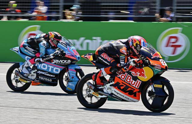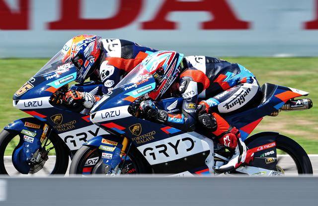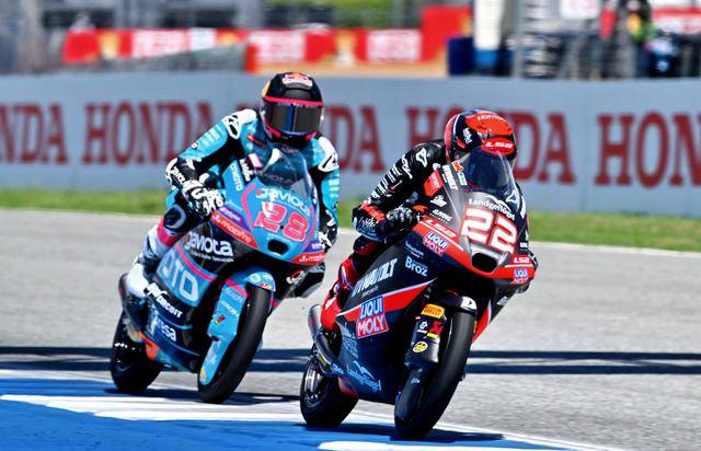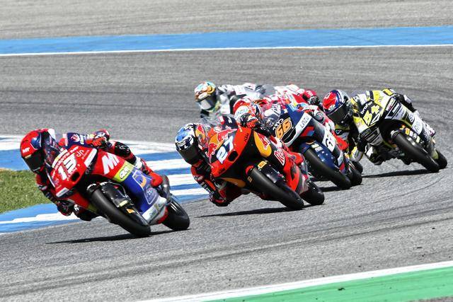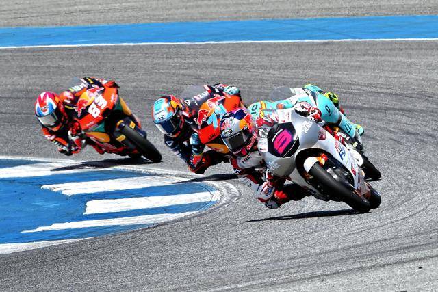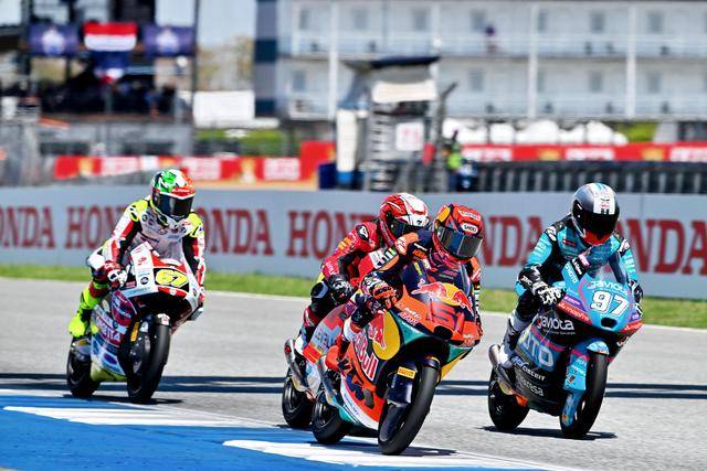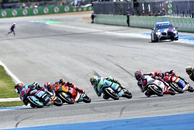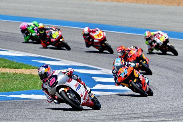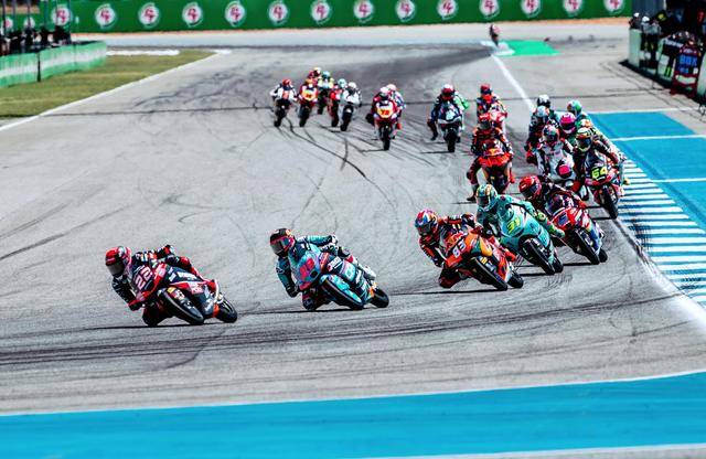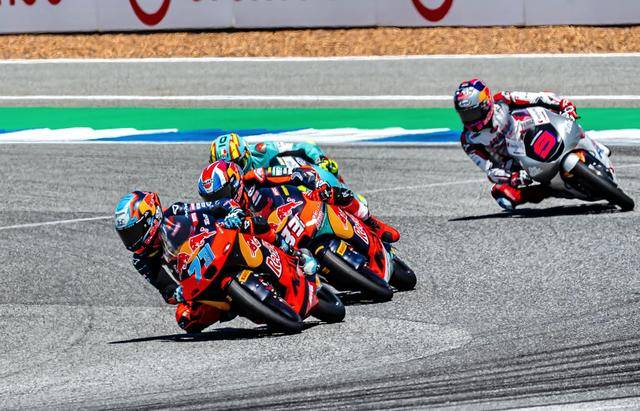 Moto3 級別正賽的賽程為 19 圈,賽事一如既往地是一場激烈的混戰(zhàn),排頭位出發(fā)的阿曼薩與 28 號車的另一位西班牙車手奎爾斯(Maximo Quiles),從紅燈熄滅開始就一直在前面糾纏一起,在賽道的每一個角落里展開較量;兩人的后面,來自三大洲的車手也同樣地相互穿插、相互超越和反超越,駕駛著 9 號賽車、今年首次進入世界錦標(biāo)賽,去年在 MotoGP 紅牛新秀杯(Red Bull MotoGP Rookies Cup)上光芒四射的印尼車手普拉塔馬(Veda Pratama),也在這一集團里與其他對手進行角逐。