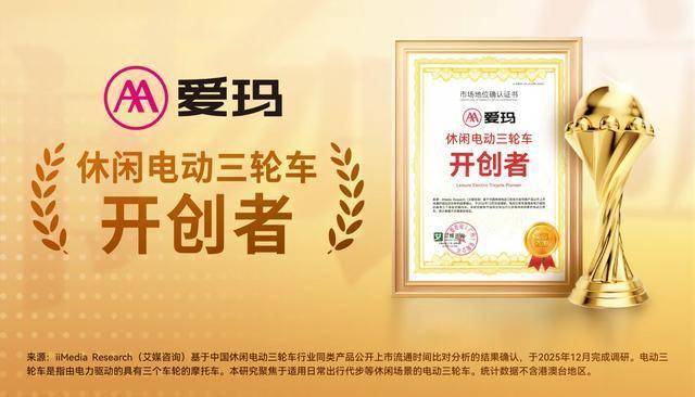 2025年12月,基于艾媒自主研發(fā)并獲得省部級重大科技專項立項的CMDAS大數(shù)據(jù)系統(tǒng)監(jiān)測及嚴格的調(diào)查,以及對中國休閑電動三輪車行業(yè)研究比對的結(jié)果進行統(tǒng)計確認(統(tǒng)計數(shù)據(jù)不含港澳臺地區(qū)),愛瑪榮獲全球領先的新經(jīng)濟產(chǎn)業(yè)第三方數(shù)據(jù)挖掘和分析機構(gòu)iiMedia Research(艾媒咨詢)授予的“休閑電動三輪車開創(chuàng)者”市場地位確認。