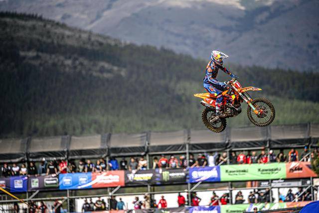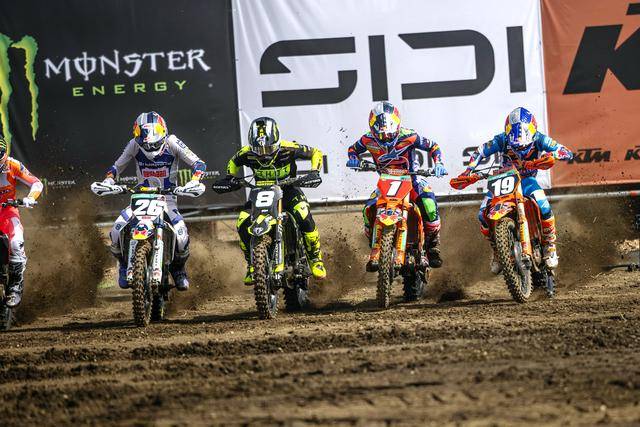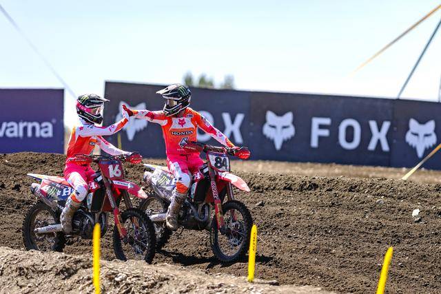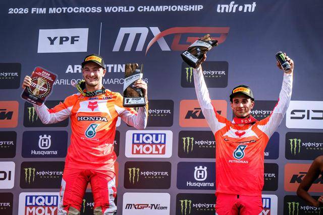 第一節(jié)比賽,賀靈斯的隊友、駕駛 16 號車的法國車手維亞里(Tom Vialle)奪得了亞軍,他也是同樣今年才轉(zhuǎn)到 HRC 陣營;應(yīng)屆世界冠軍、駕駛 1 號車的費布爾(Romain Febvre)拿到了季軍。第二節(jié)比賽,尾隨在賀靈斯后面,費布爾落后 4 秒多拿到了亞軍,駕駛 243 號車的斯洛文尼亞車手蓋沙(Tim Gajser)奪得了季軍。
