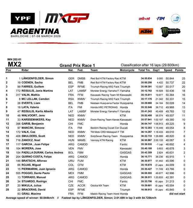 MX2 級別,應(yīng)屆世界冠軍、駕駛 1 號車的德國車手朗根菲爾德(Simon Langenfelder)在兩節(jié)的正賽里都順利奪冠,拿到了新賽季首站比賽的全勝。