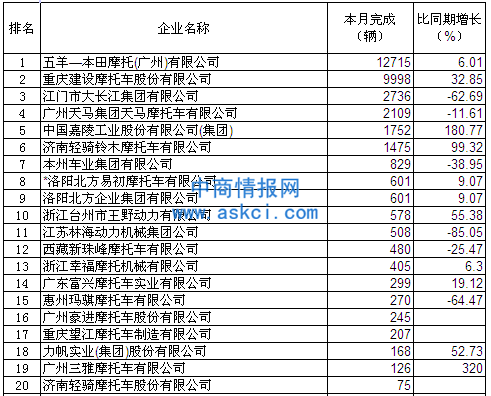 • 2019年11月前十家摩托車生產(chǎn)企業(yè)銷量排名